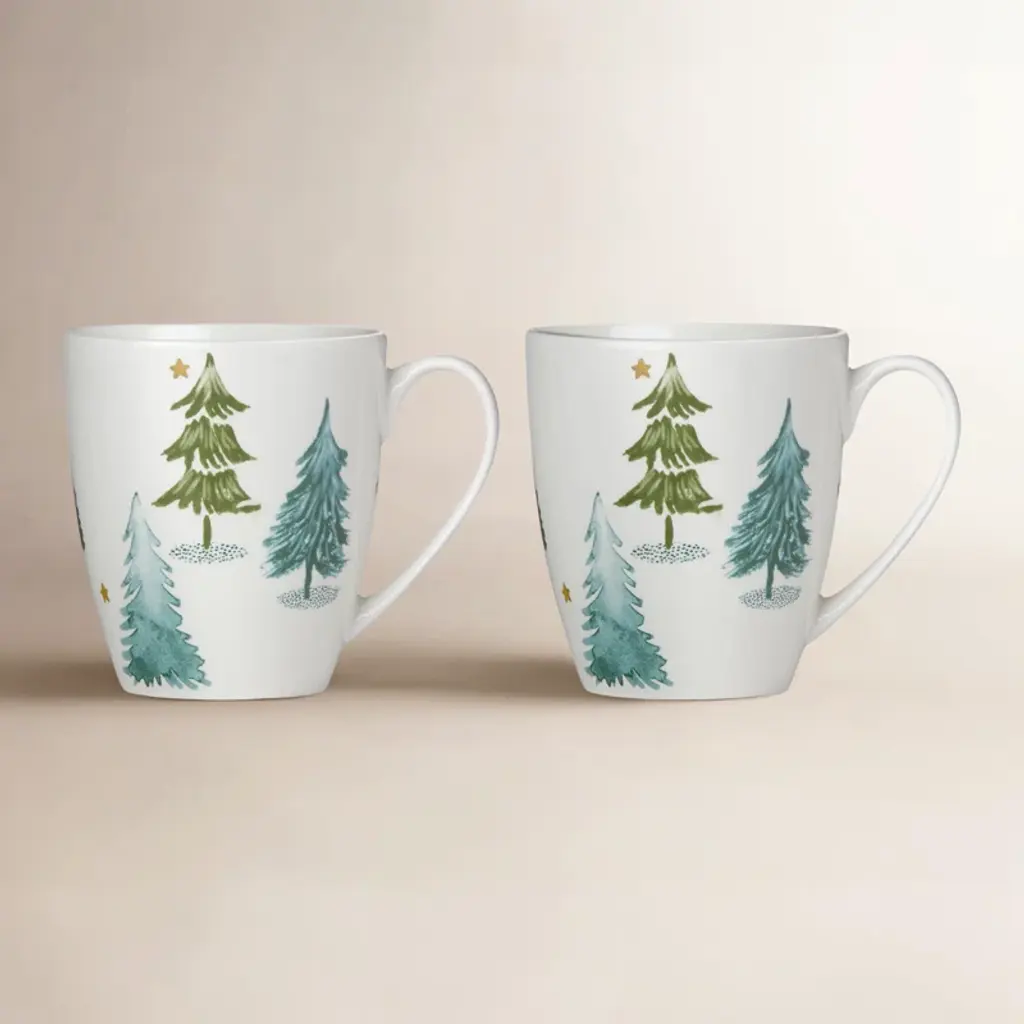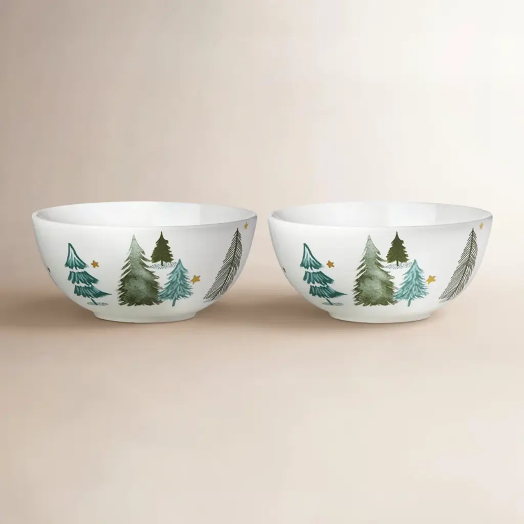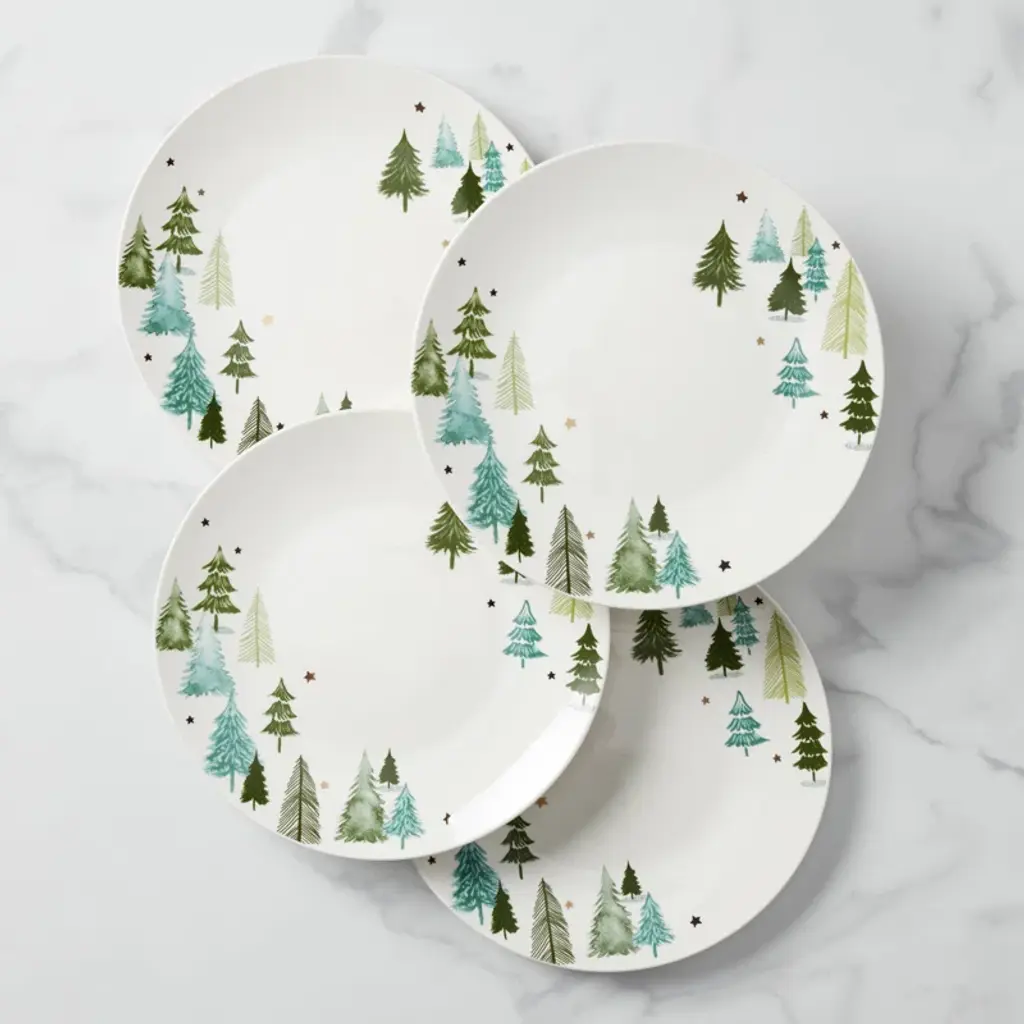 White ceramic is decorated with whimsical pine trees and metallic stars on this set of four dinner plates. Part of the Balsam Lane Collection, the set is perfect for entertaining.