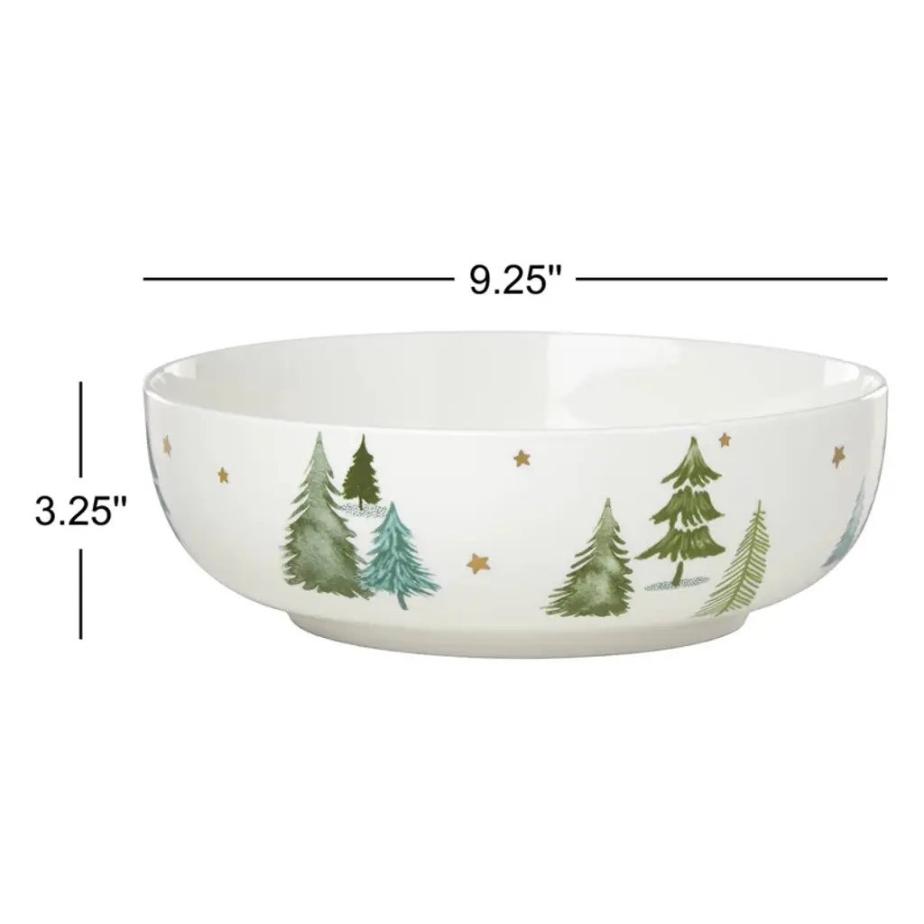 Delightful and fun, this whimsically designed dinnerware collection is perfect for holiday entertaining and beyond. Painterly evergreen trees decorate the white porcelain dinnerware with festive metallic golden stars accented throughout. This product features micro-safe gold and is dishwasher safe too for easy cleanup.