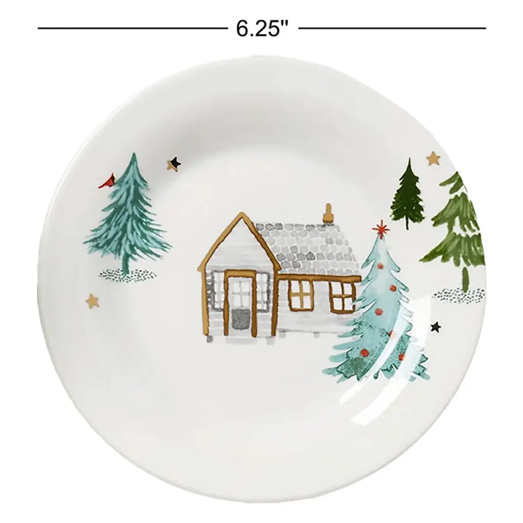 This 4-piece tidbit plate set features a winter scene of lush trees, artistic cabins, and golden stars.