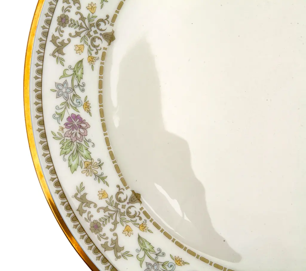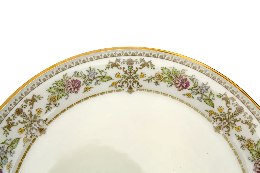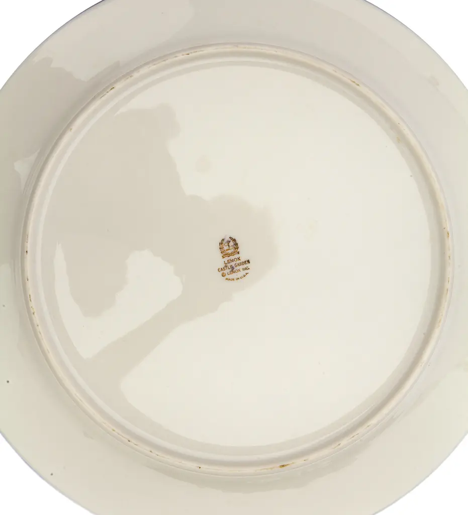 Large serving tray/plate by Lenox, the pattern "Castle Garden" is from the 1970's. The plate is decorated in shades of pink, yellow & green, with a gold rim. This classic pattern has since been discontinued. by Lenox in perfect condition.