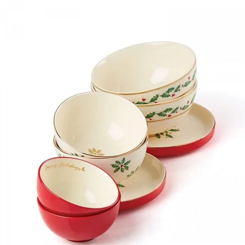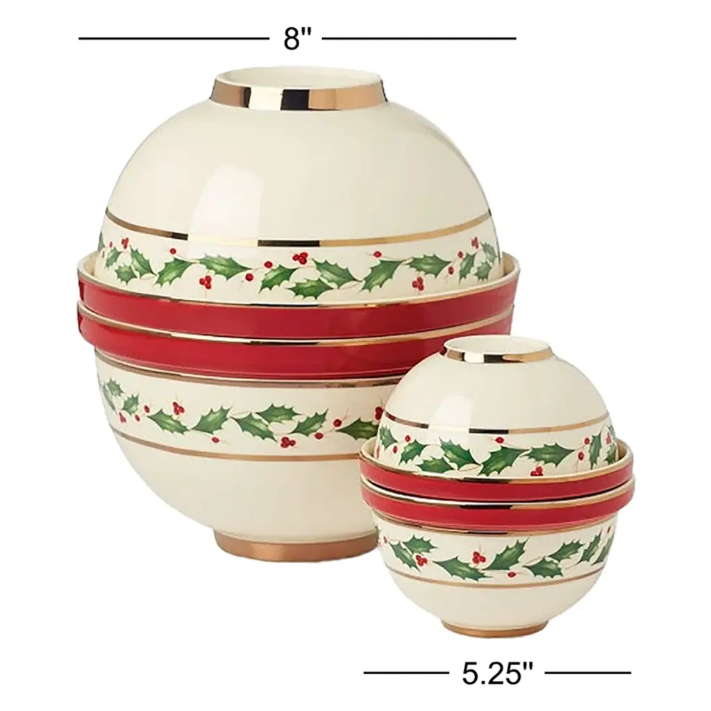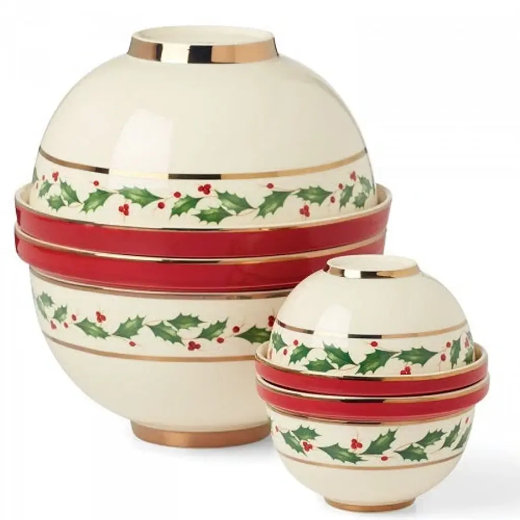 Our popularn Holiday nesting dinnerware set is back for the holidays. Now available in our classic holly and berry motif, this eight-piece set has everything you need for dinner for two or laying out tidbits for guests. Its compact design is perfect for storage when it's not in the season.