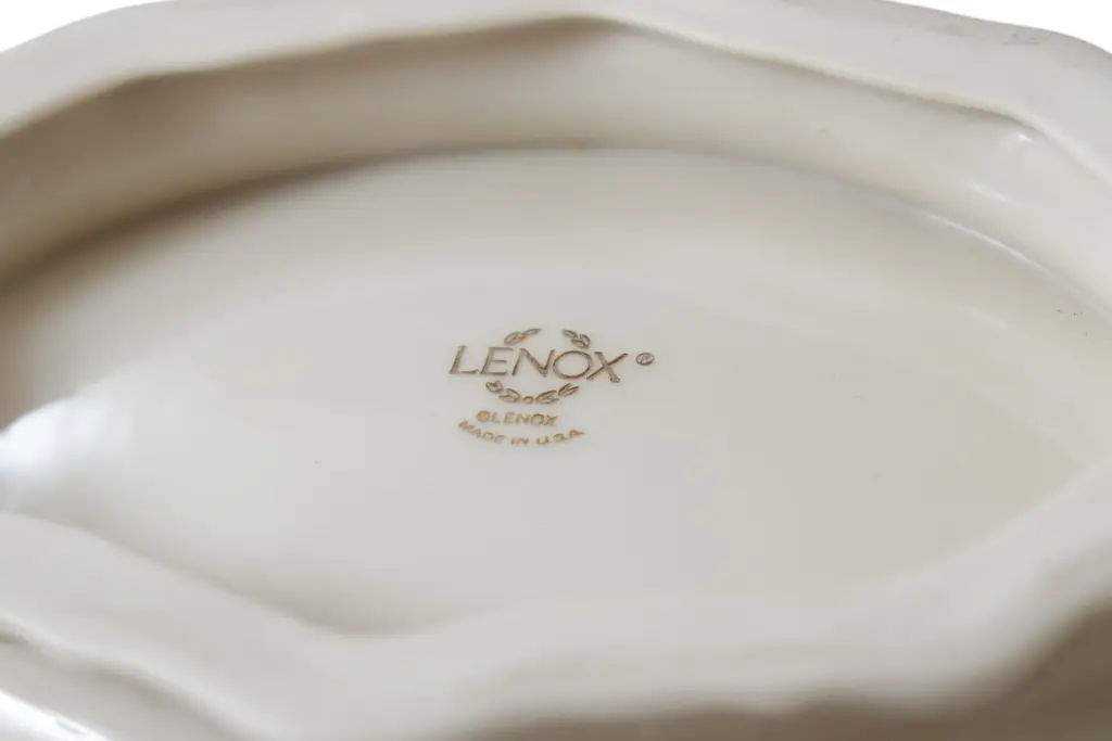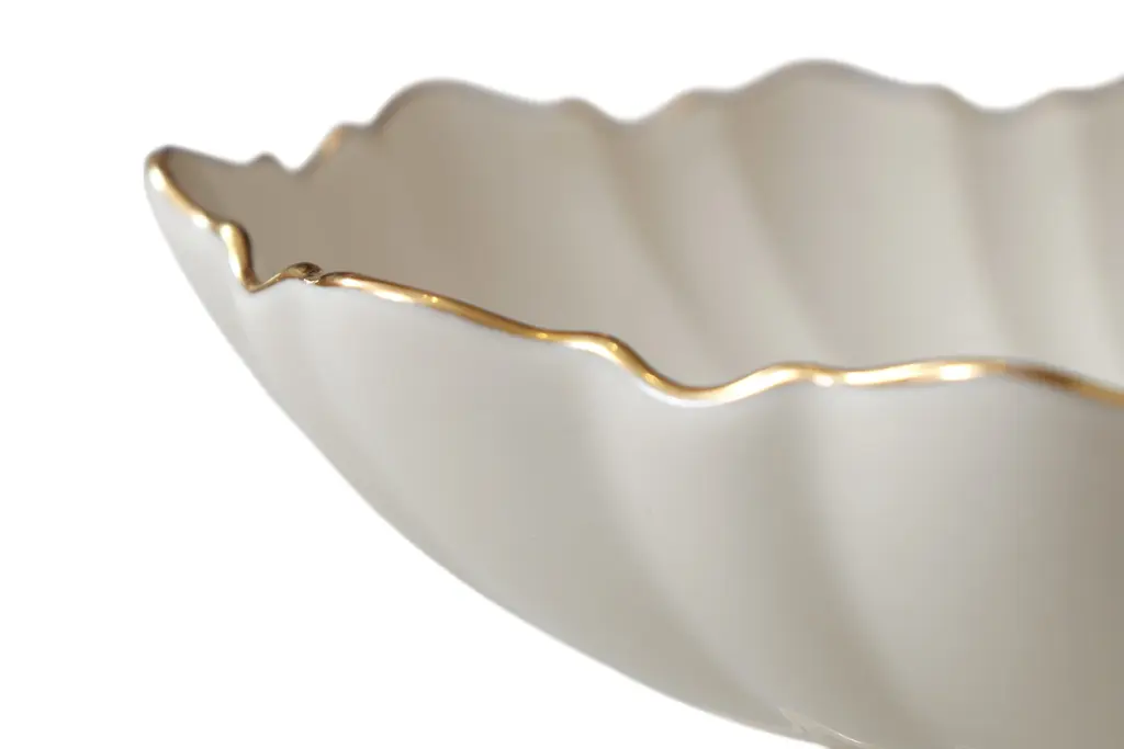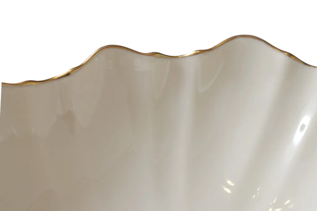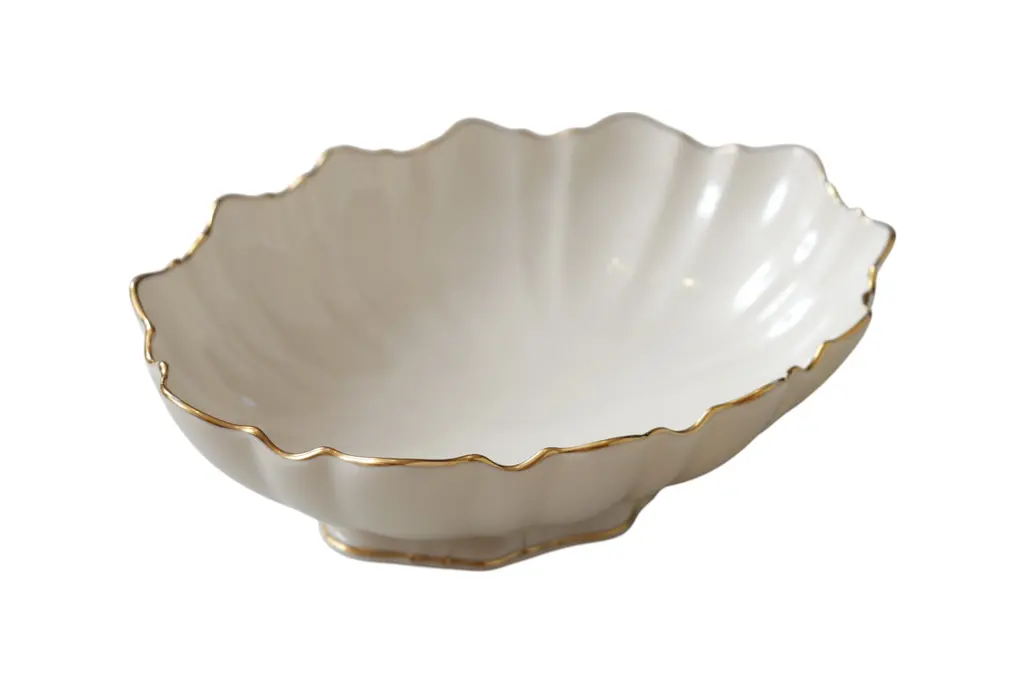 A ceramic scalloped dish by Lenox, made for their Symphony collection circa 2000. The undulating fluted shape is decorated with a gilt trim. Marked underneath ‘Lenox Made in the USA’.