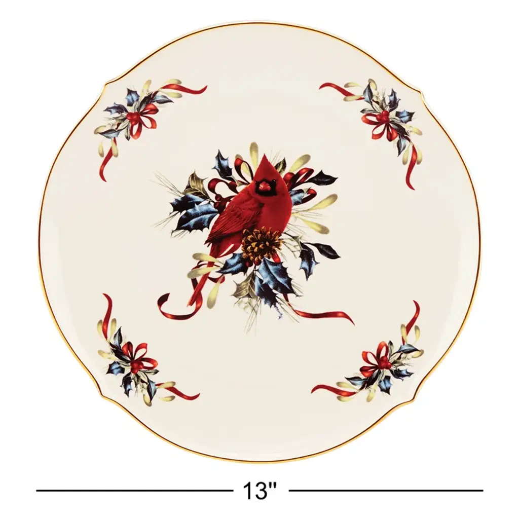 Add a pop of color and whimsy to your table with this Lenox Round Platter. Made from high-quality porcelain china, it showcases a wintery cardinal motif in blue, red, and ivory hues. This versatile platter is dishwasher safe, making clean-up a breeze after serving up your favorite appetizers or desserts. However, it's not microwave safe, so be sure to heat your treats separately. With its round shape and playful design, this platter is sure to become a conversation starter at your next gathering.