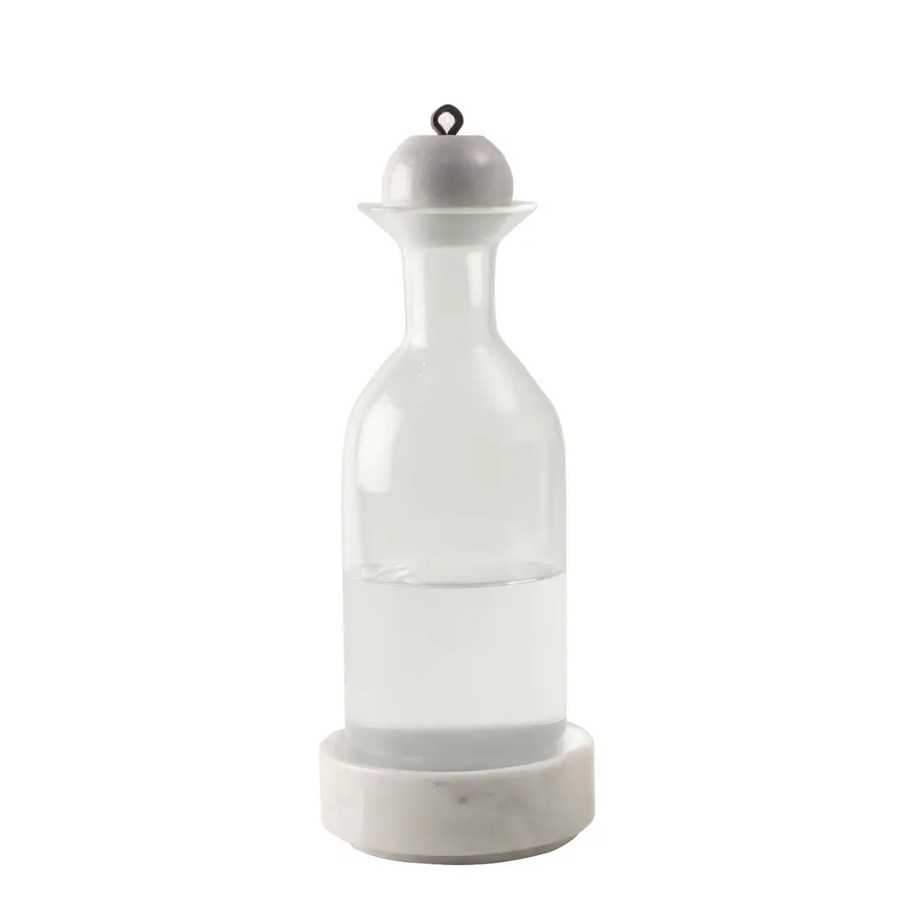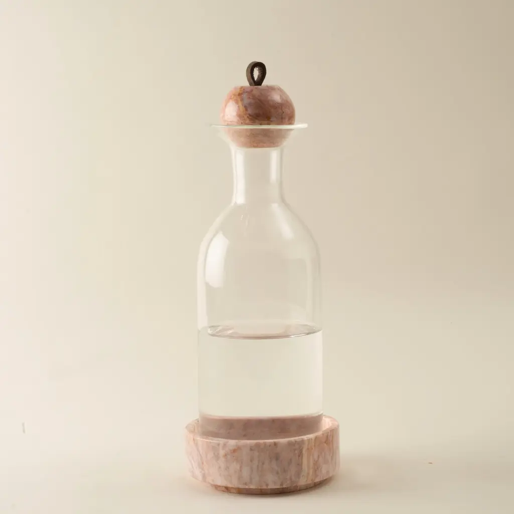 Simply perfectly beautiful. Water jug handmade in borosilicate glass, the base in pink marble and the lid, as is iconic in Anjacob, a sphere in pink marble with a leather handle.Ideal in a dining table, dresser or bedroom bureau. You will love her...Less is More Collection