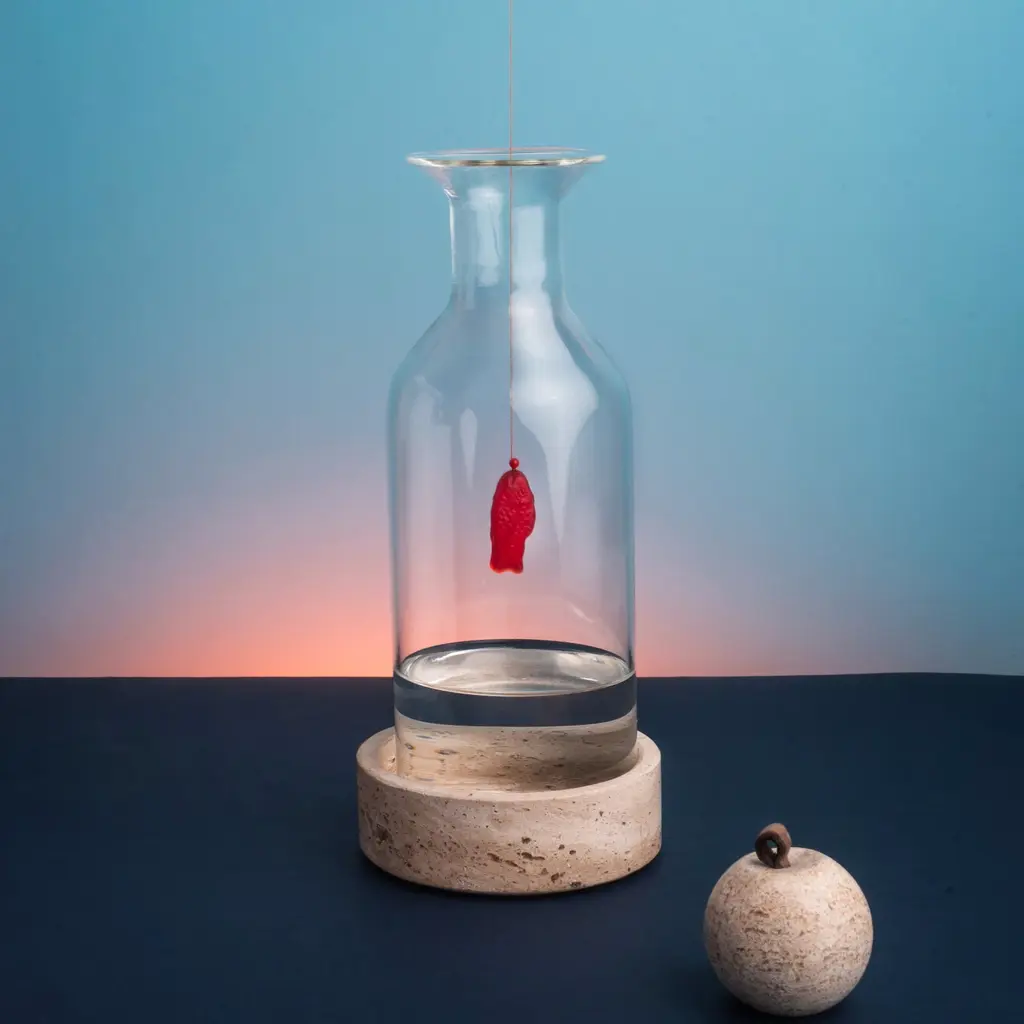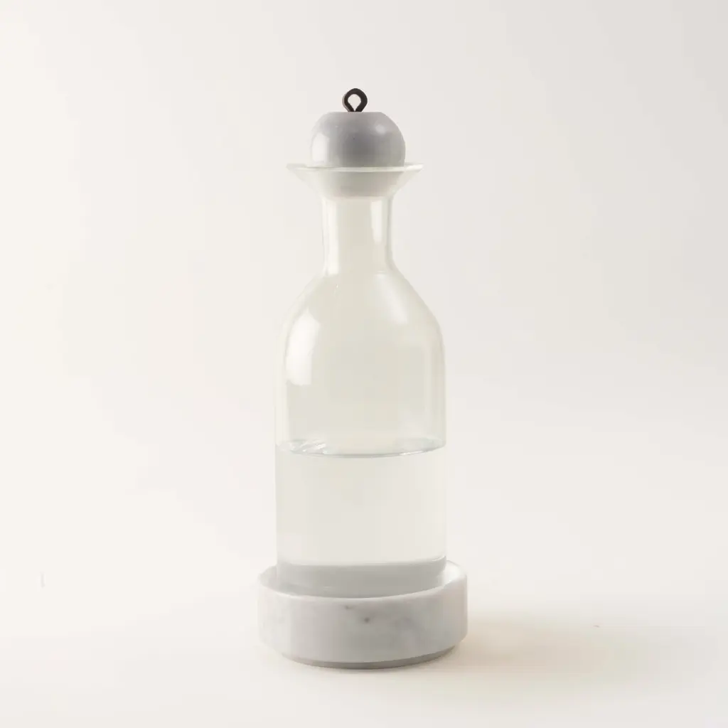 Simply perfectly beautiful. Water jug handmade in borosilicate glass, the base in travertine marble and the lid, as is iconic in Anjacob, a sphere in travertine marble with a leather handle.Ideal in a dining table, dresser or bedroom bureau. You will love her...Less is More Collection