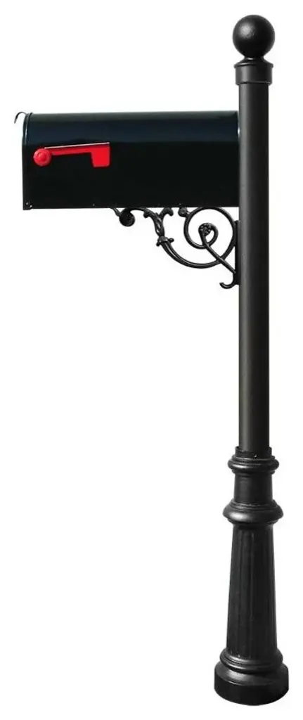 Lewiston post system with E1 Economy mailbox, mounting plate, ornate base and pineapple finial, WhiteOur Lewiston Post is made from rust-free cast aluminum with a durable weather resistant finish and comes with a E1 Black Economy Mailbox, support brace with mounting plate, decorative pineapple finial and ornate base. E1 Economy mailbox is made of galvanized steel with a smooth rust-resistant finish, steel latch and red aluminum flag. Post, support brace, finial and base color: White.Beautiful post with fluted base and ball finialThe post mounts deep down into your lawn or sidewalk and is made from solid cast aluminumProtective, weather-resistant, white powder coated finishIncludes mailbox mounting bracket and support braceComes with E1 Economy mailbox, which is made of galvanized steel with a smooth rust-resistant finish, steel latch and red aluminum flag.Product Dimension: 6.5"x19"x5''2"Color: White