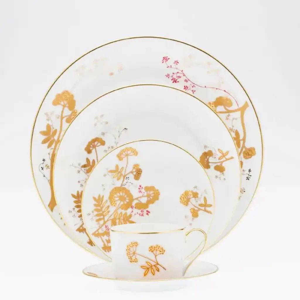 With an oriental gold floral design, Lhassa dinnerware brings a touch of elegance to the table. Five-piece place setting includes dinner plate, dessert plate, bread/butter plate, teacup, and saucer. As the oldest porcelain factory in the French city of Limoges, Royal Limoges boasts a long history of creating hand crafted dinnerware from its own kaolin clay. Since 1797, its exclusive patterns have been enjoyed by clients worldwide.