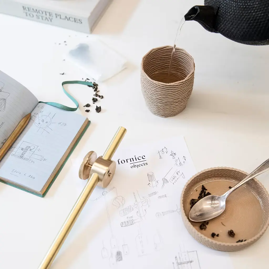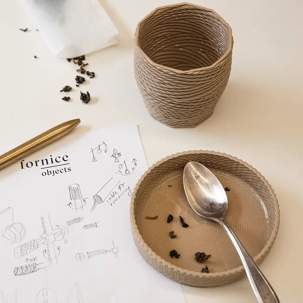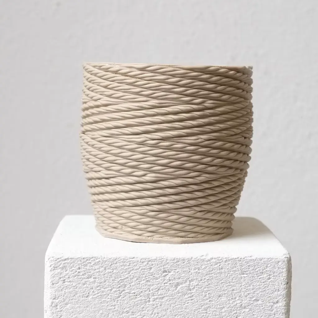 The flawless result of 3D printing and unrepeatable details of artisan's touch make this set of four teacups truly unique. Crafted of porcelain and offered in an elegant shade of beige, the cups stand out for their captivating texture whimsically inspired by licorice twists. A thin layer of transparent glaze is applied to the interior to ensure it is watertight, while the exterior is left unrefined for a raw aesthetic statement. Dishwasher safe.