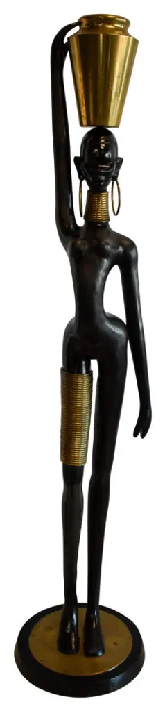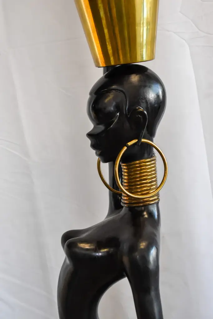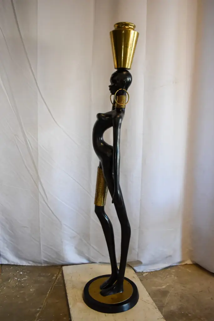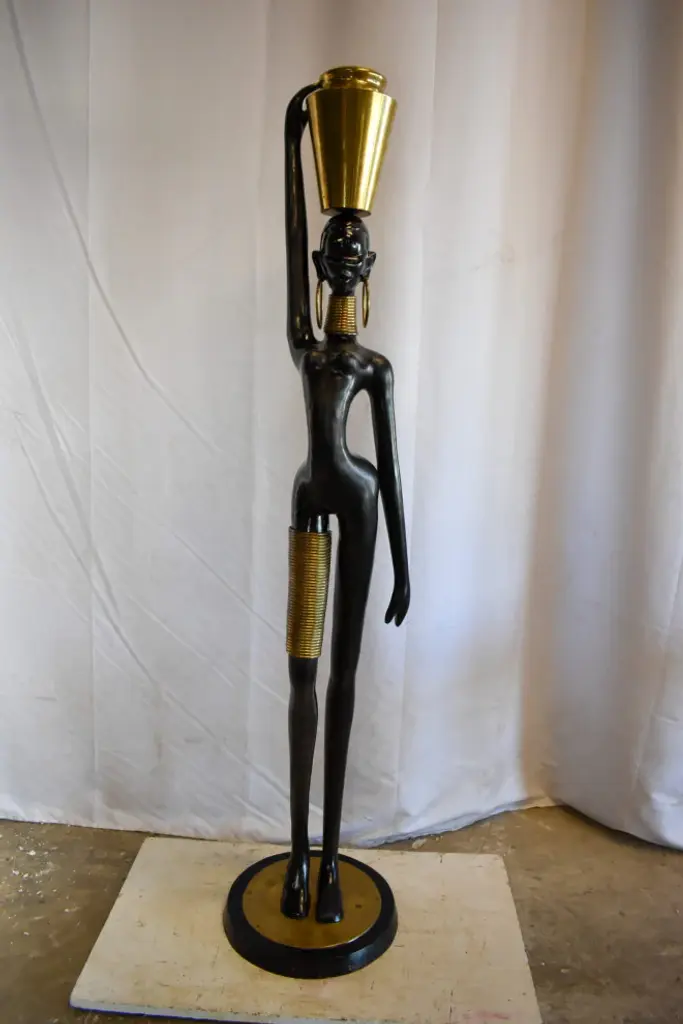 This exotic woman, representing a cultural group of Africa and Asia, stands powerfully while balancing a hug on her head. Several details, including the metal rings around her neck, combine culture, beauty, and elegance into one statue. Size: 14"L x 14"W x 63"H. Weight is: 40Lb