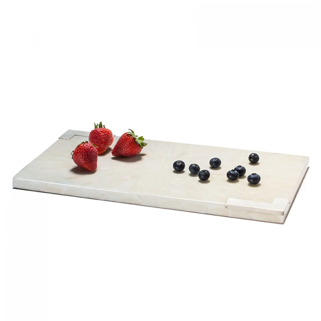 - Handcrafted serving board made of wood and cow bone from Colombia. - Almond shaped bone is intricately inlaid to create a unique aesthetic, which is completed with a high-gloss lacquer finish. - Polished German silver decorative accents.