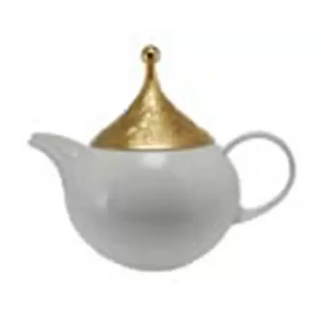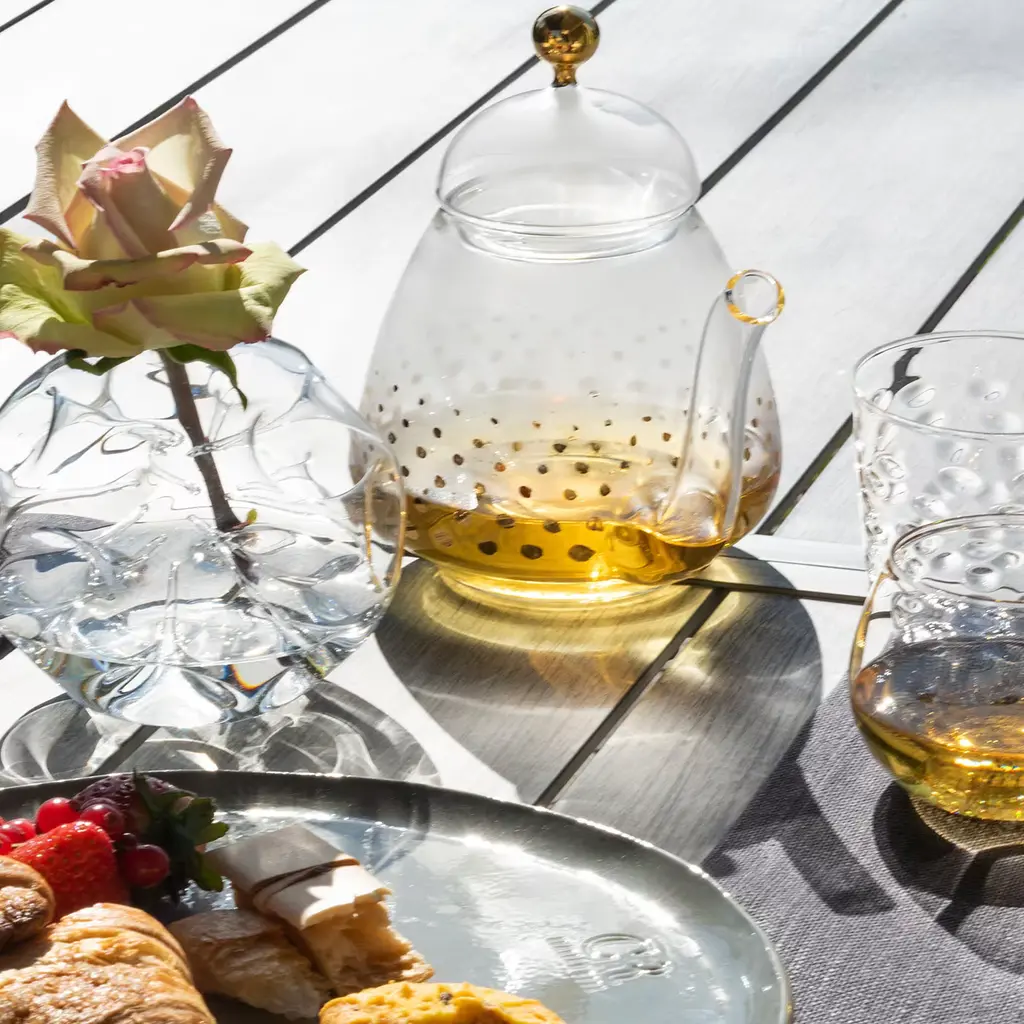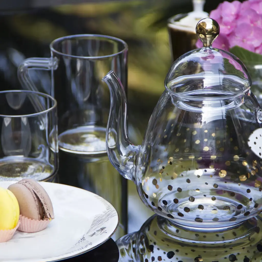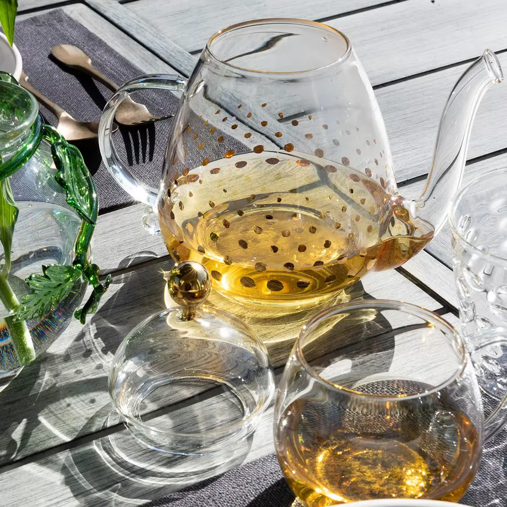 This stunning teapot is sure to make a sophisticated statement on any occasion. It was crafted of handmade mouth-blown transparent glass and features a traditional shape with a sinuous bottom, an upward spout, a curved handle with a curl, and a domed lid. The decoration that graces the body of the piece, and comprises a series of gold polka dots, mirrors the gold sphere of the lid's handle. The effect is sparkling and elegant and will enliven a modern or contemporary home when not in use. Capacity of four to five cups.
