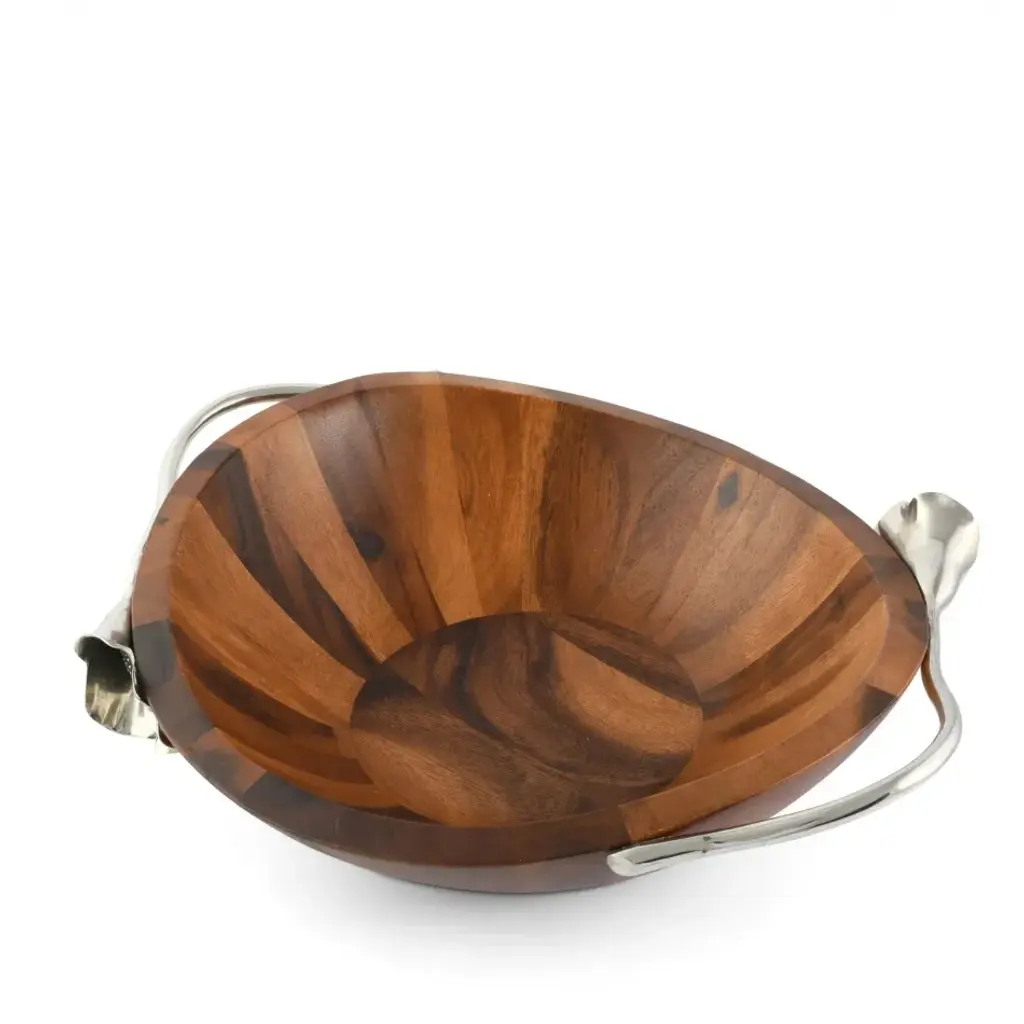 Upgrade salad service with this ornate bowl inspired by the majesty of a forest and the grace of a summer garden. We pair the natural beauty of durable acacia hardwood with solid, pure pewter hand-fashioned into lithe lilies that act as strong handles. When not filled with crisp greens, this handcrafted salad bowl makes a stylish centerpiece, either alone as is or holding vibrantly colored fresh fruit. It also serves as a unique artisan-designed gift perfect for the discerning host or hostess. Vagabond House is a family-owned American company specializing in fine pewter tableware, servingware and giftware. Largely inspired by nature, their exclusive products are designed to be unique, functional heirlooms for those who seek to express tradition and style in both family and formal entertaining.
