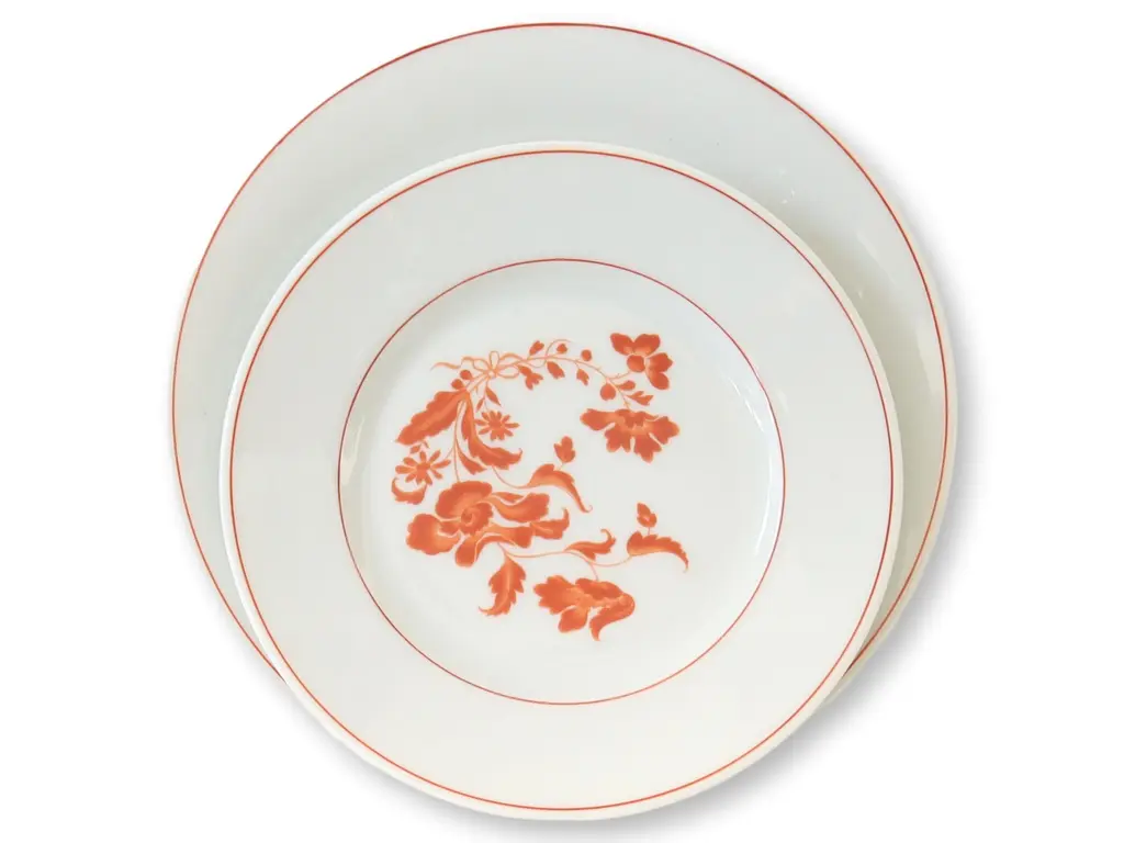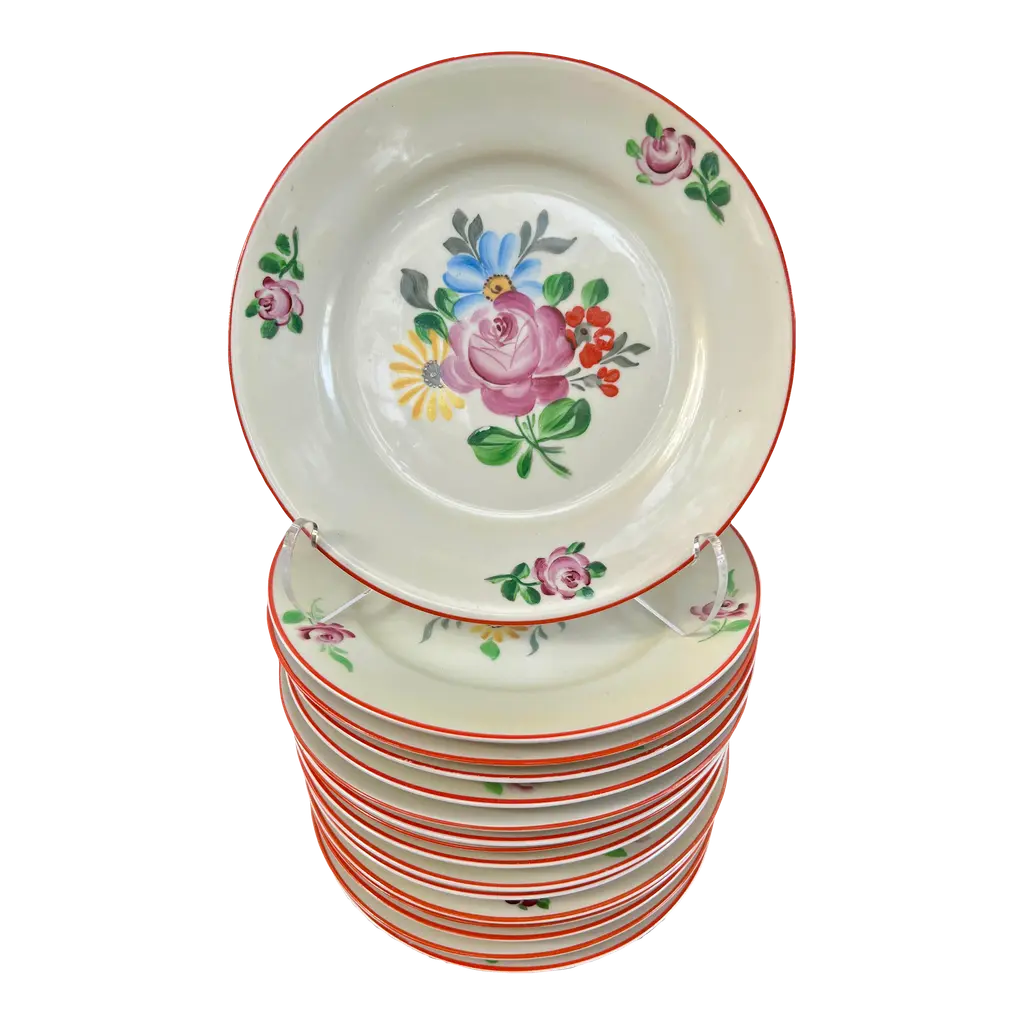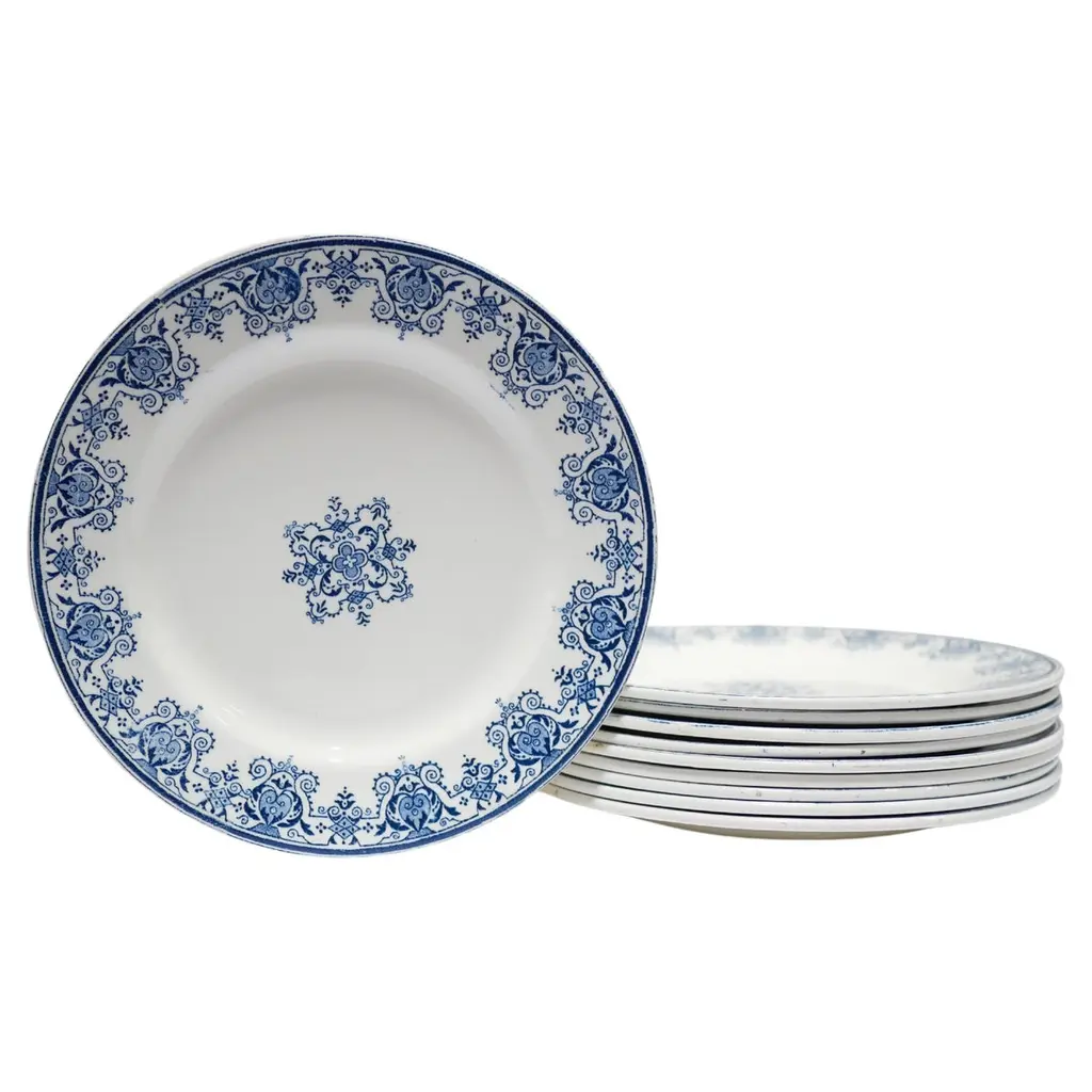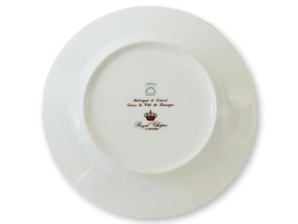 Set of eight French Limoges plates in two sizes. Dimensions: 4 large salad, 7.75"Dia x .75"H; 4 small dessert, 6.5"Dia x .75"H. Maker's mark on underside.