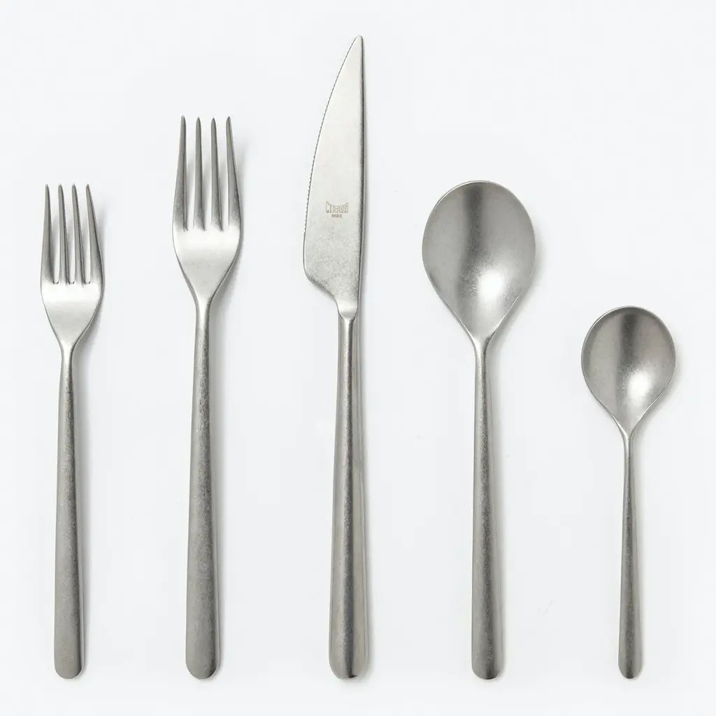Made in Italy, the Linea Flatware 5 Piece Set is coated with a beautiful brushed finish. Featuring crisp lines and a minimalist aesthetic, this collection brings a touch of Italian poetry to the table. Created in 1947, Mepra is a family-owned and operated company with a worldwide presence in flatware, cookware, and stainless-steel products. Today, Mepra flatware and kitchenware appear on the tables of the most prestigious hotels, award-winning restaurants, and artisanal-centered homes. Bring the magic of three generations worth of Italian traditions, designs, and lifestyles into your kitchen and dining room today. Stainless Steel plating features a special vintage process that gives it a rustic, warm, and elegant appearance while still being durable and inoxidizable coating. Winners of the 2020 Good Design Award, the Bronzo, Rainbow, Oro Nero, Champagne, Oro, and Ice Oro Collections are perfect for the most refined and stylish homes with their pure lines and harmoniously light forms. Champagne Ice, Ice Bronze, Ice, and Ice Oro Nero are coated with a PVD Titanium Coating that is tested and guaranteed for more than 3000 washes in a commercial dishwasher. The special Titanium Plating was originally developed by NASA, resulting in a durable and inoxidizable coating like non-other.