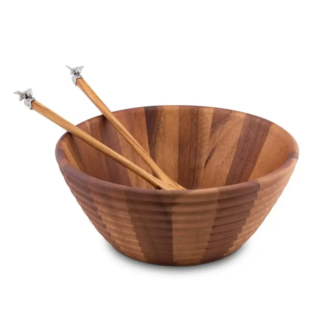 Perfect for serving everything from salads to movie-night popcorn, this beautiful wooden serving bowl set is crafted from durable and attractive acacia wood. Included fork and paddle and are the perfect accessory for your serving bowl. Use them for tossing and serving salad. The timeless look of wooden serveware coordinates with nearly every decor style. Great for making a statement when hosting, or just for serving a weeknight dinner beautifully. Fun and festive, you'll find our acacia wood serveware at the center of your table for years to come.