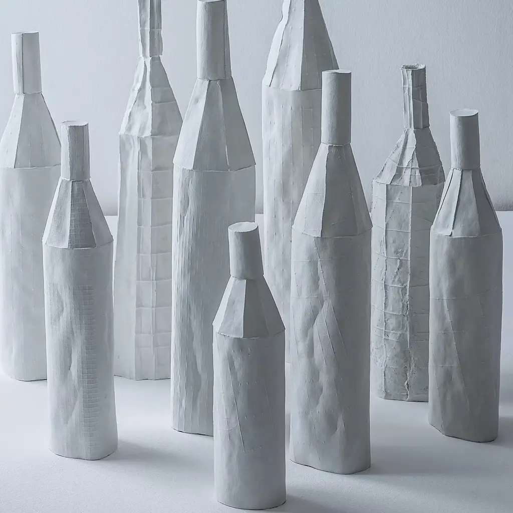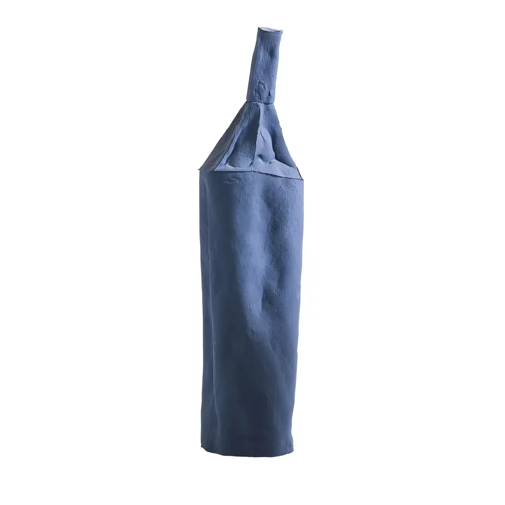 Inspired by the shapes of everyday objects, the Cartocci Collection showcases objects handcrafted of paper clay, a special mix of clay and natural fibers that displays a unique, light texture. This sculpture is in the shape of a stylized bottle with a tall cylinder and tapered neck, and a smooth surface in a delicate sky blue color. A striking addition to a console or side table in a modern décor, this object will be a well-received housewarming or wedding gift. Every one of Paola Paronetto’s creations is unique. Slight variations in shape, colour and size are to be considered a guarantee of authenticity and value. They are finished with non-toxic satin-finish enamels. Although very rarely, it is possible for them to leak after long periods of exposure to water. It is therefore advisable to test their water resistance before using them on delicate surfaces. They should not be used as dining utensils. The white pieces can be washed with water or sanitizing products, whereas the coloured pieces must be treated more gently and cleaned with a feather duster or a soft cloth, dry or moistened very slightly with water.