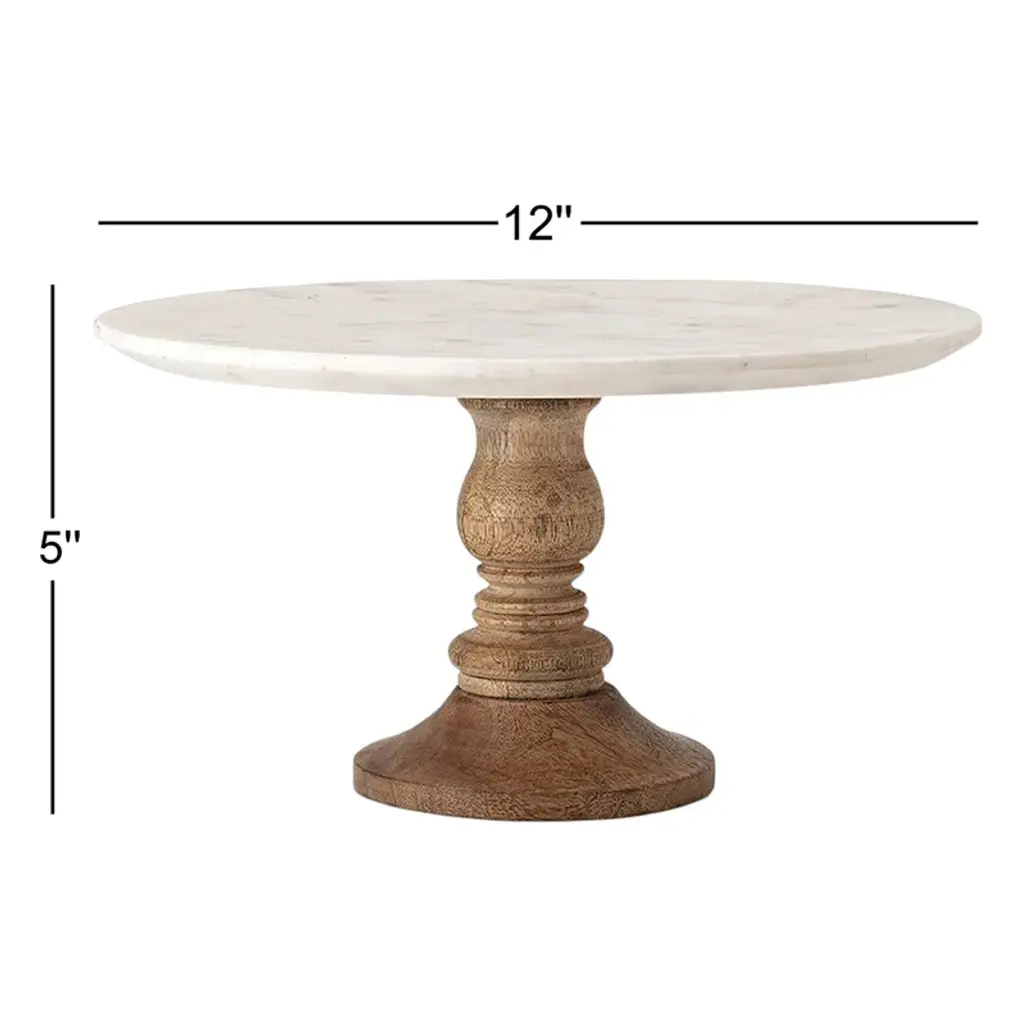 Serve your guests tasty treats with this round cake stand. The top of the stand features a smooth white marble plate that makes any dessert look appetizing. The plate rests on a sturdy mango wood stand with a pedestal base in natural brown finish. Add this stand to a modern-contemporary dining room table or kitchen counter for an elevated look.