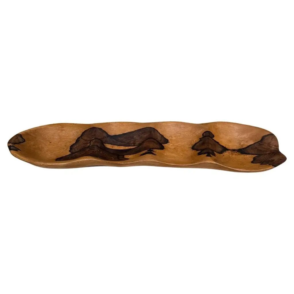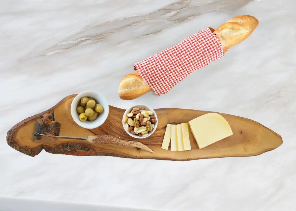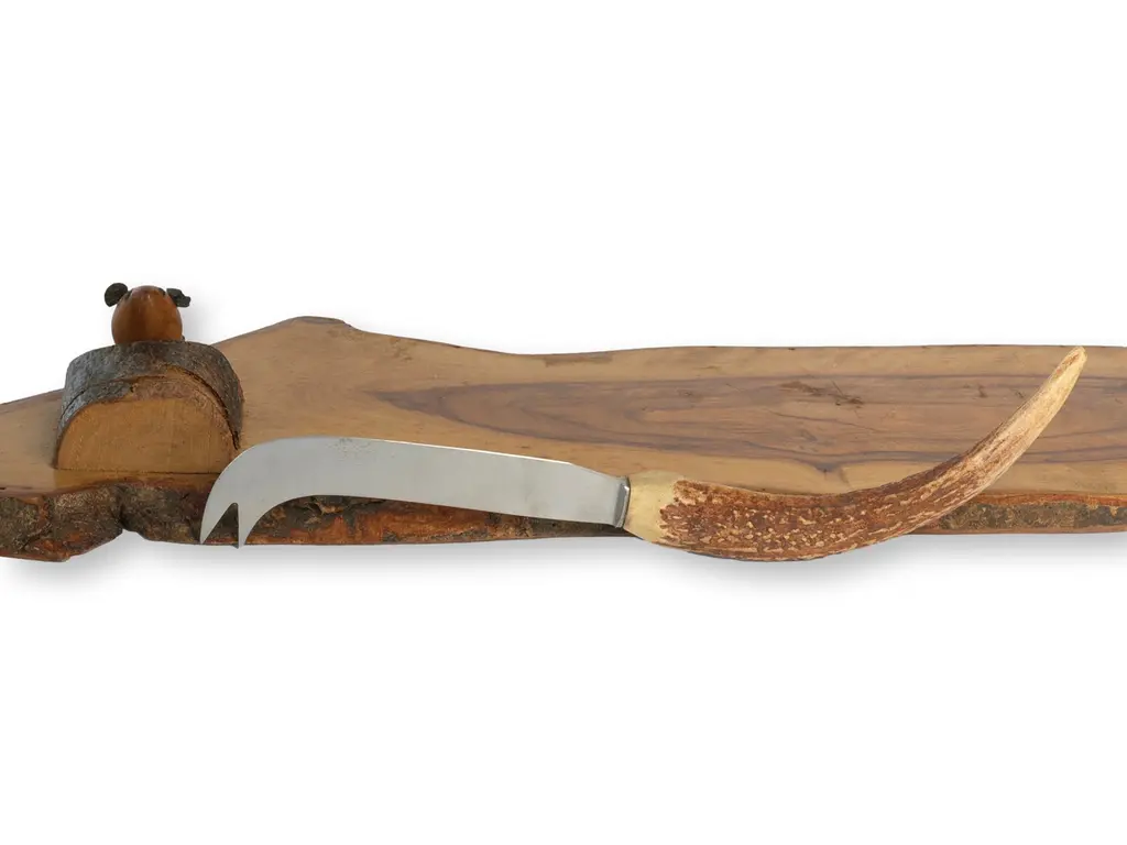 Serve with rustic charm using this unique live edge wood board featuring a whimsical hand-carved mouse tucked into the corner. Complete with a stag horn-handled cheese knife, this set is perfect for cheese, charcuterie, or bread service. A delightful conversation piece for any kitchen or table setting. Unsigned. Knife: 9.5"L x 1"W. .