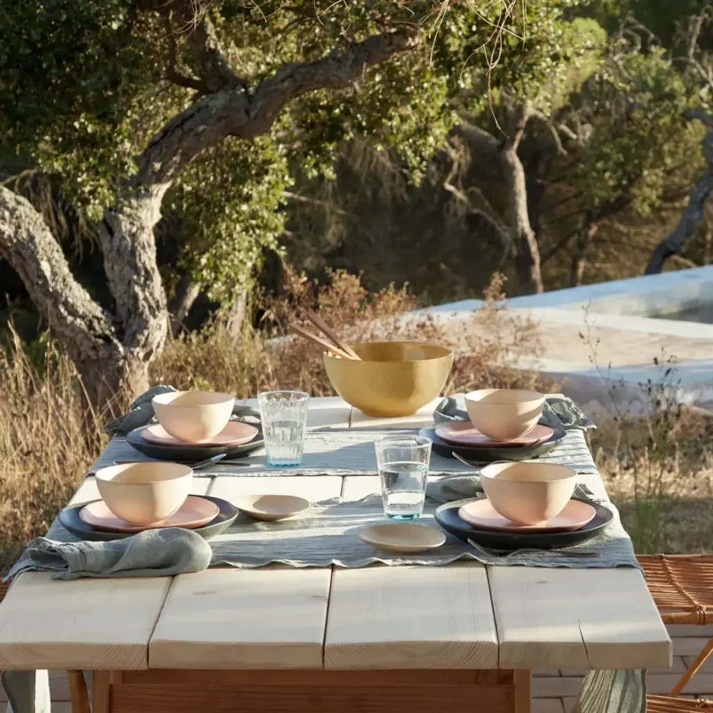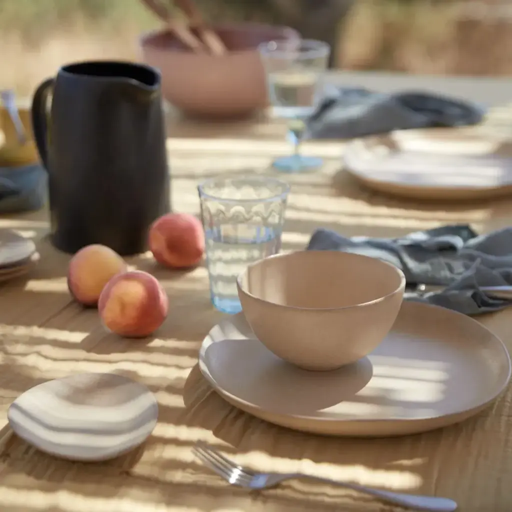 Comforting matte champagne and mauve rose colors Livia presents elegant, curvy silhouettes with an organic look and feel. The champagne and mauve rose colors stand out on their own yet they are surprisingly complementary. Their calming and comforting matte-speckled glazed surfaces inspire the senses to refocus and reconnect with the present moment. Named after a small fishing village famous for its colorfully painted wooden houses, Costa Nova combines ancient European craft traditions, elegant design and quality to create fine stoneware pieces. Using the best natural resources in Portugal, Costa Nova pieces are known for their color and exceptional durability.