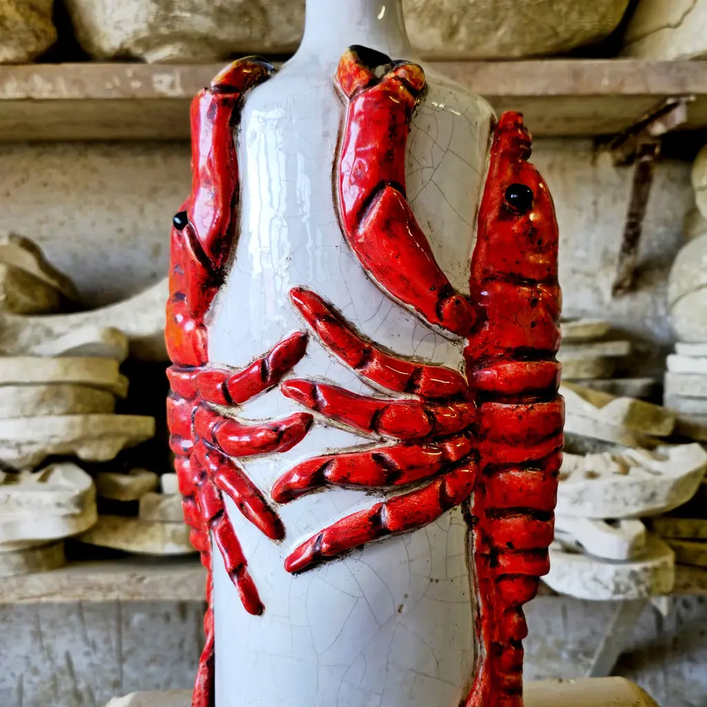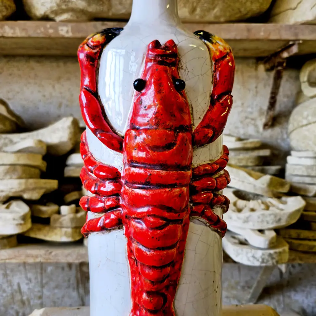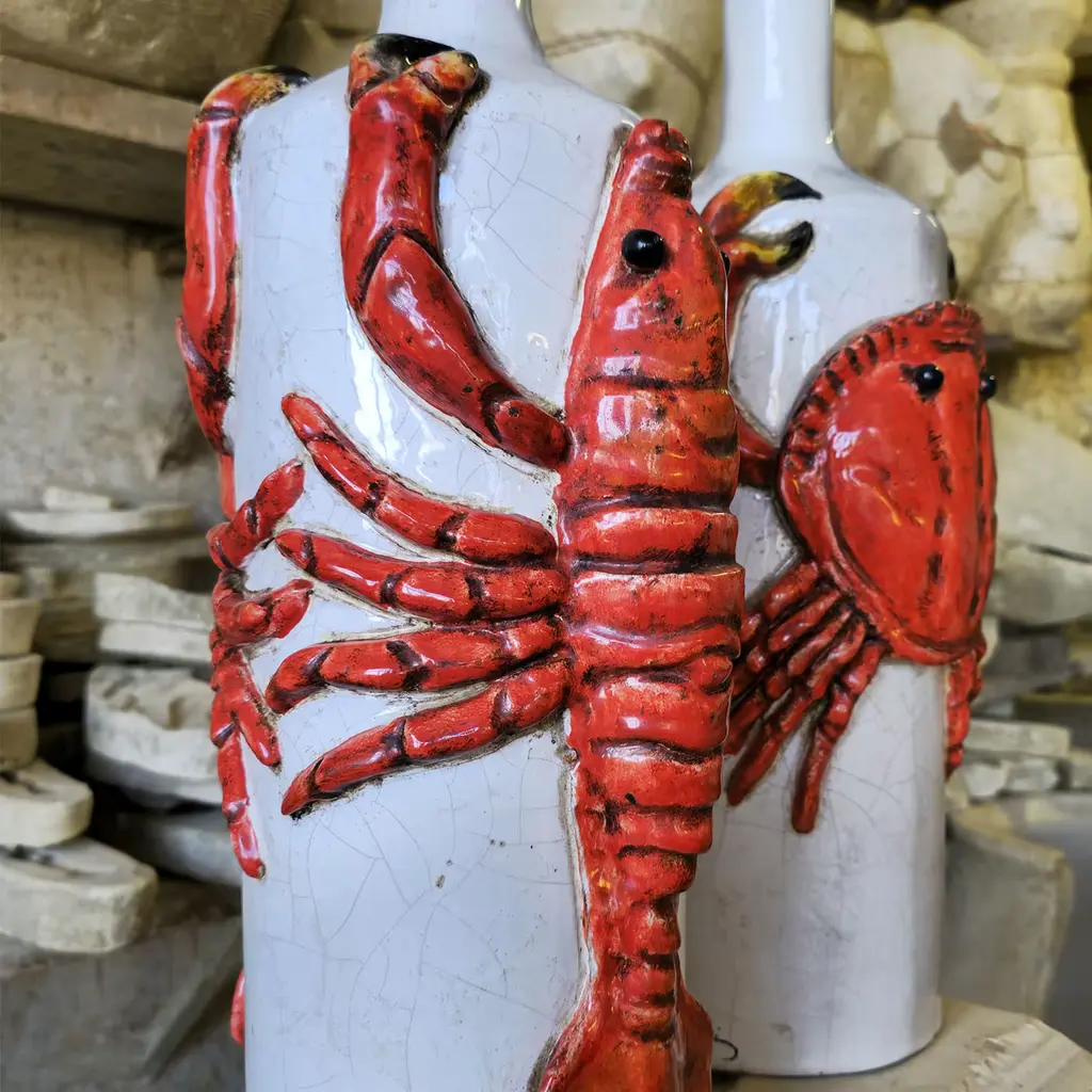 Playfulness and exclusivity are effortlessly synthesized in this ceramic bottle, singular handmade piece with a striking visual character. Ideally complementing refined coastal decors, it sports detailed raised lobsters that seems to tie the bottle in a tight embrace. Rich in chromatic contrasts, each bottle is a singular piece expression of artisan quality.