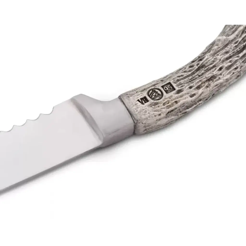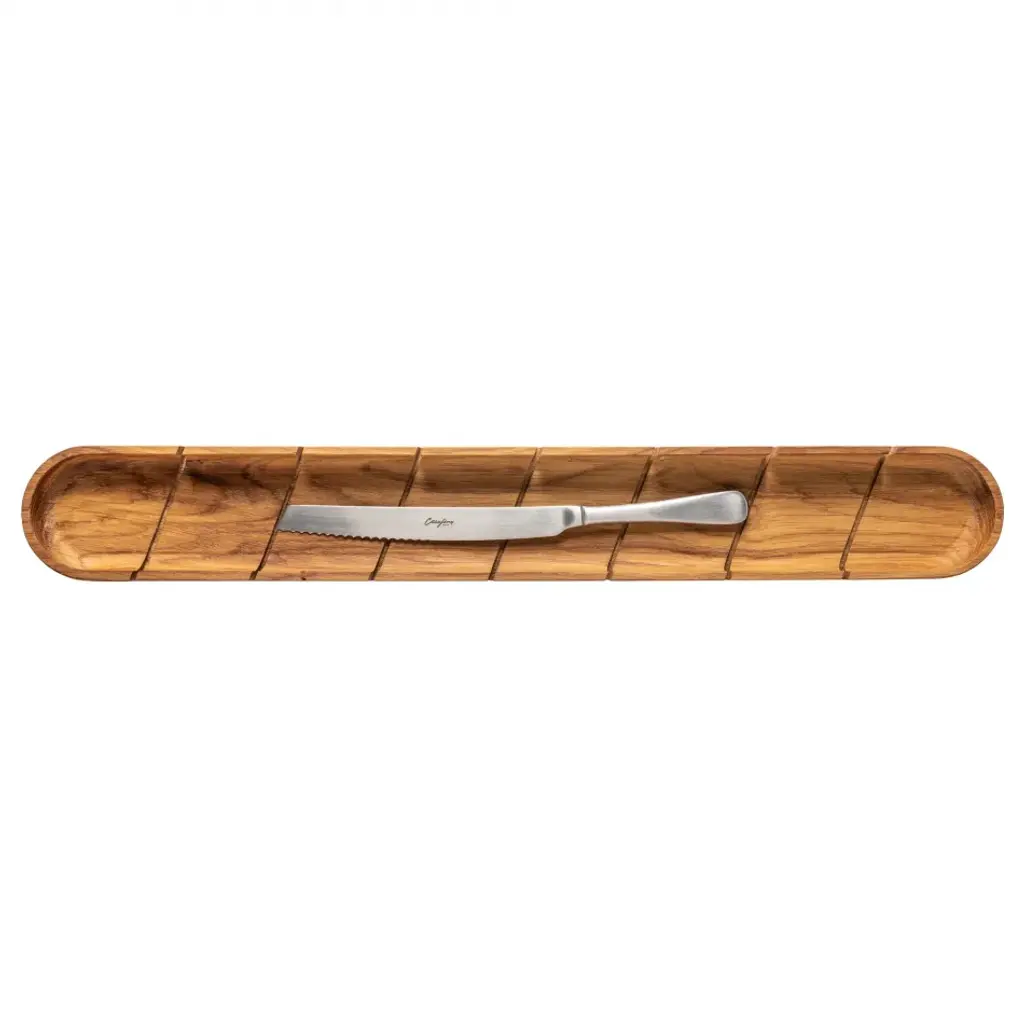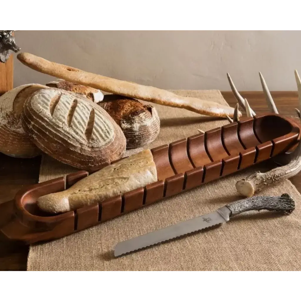 We think this Vagabond House Baguette Board with Antler Handle knife is just the best thing since sliced bread. Why Because it has built in guides to help you perfectly slice bread every time you serve it. Warm toned, hard acacia wood is hand-crafted into a bread board with cutting guides so you and guests can slice baguettes right at the table if you choose. A unique pewter antler handled bread knife comes with the board to do the slicing. The bread knife handle is hand-cast and finished to look exactly as if it were natural antler. A light antiquing of the pewter allows for every detail of the amazing metal work to be seen. Vagabond House is a family-owned American company specializing in fine pewter tableware, servingware and giftware. Largely inspired by nature, their exclusive products are designed to be unique, functional heirlooms for those who seek to express tradition and style in both family and formal entertaining.