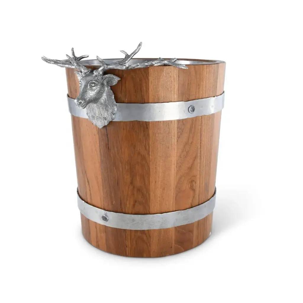 Matching, pure-pewter elk heads embellish opposite sides of this piece as they mount against strips of bark and acacia wood. The detailed elk figures are remarkably realistic, with full racks of antlers, soft eyes and coats that you want to touch. Keep the drinks cold and the conversation flowing with Vagabond House's Natural Log Elk Ice Bucket. Excellence in design is a Vagabond House hallmark, the wood bucket has a removable, glass insert to protect the wood from excess moisture and allow for a thorough cleaning between uses. Vagabond House is a family-owned American company specializing in fine pewter tableware, servingware and giftware. Largely inspired by nature, their exclusive products are designed to be unique, functional heirlooms for those who seek to express tradition and style in both family and formal entertaining.