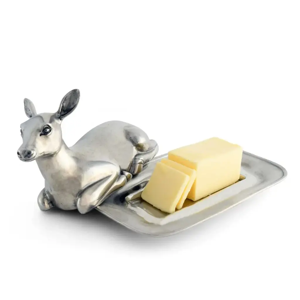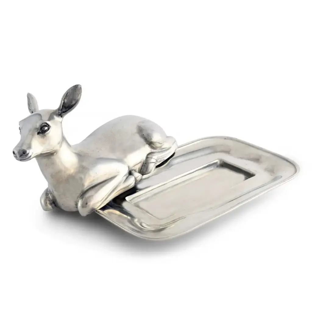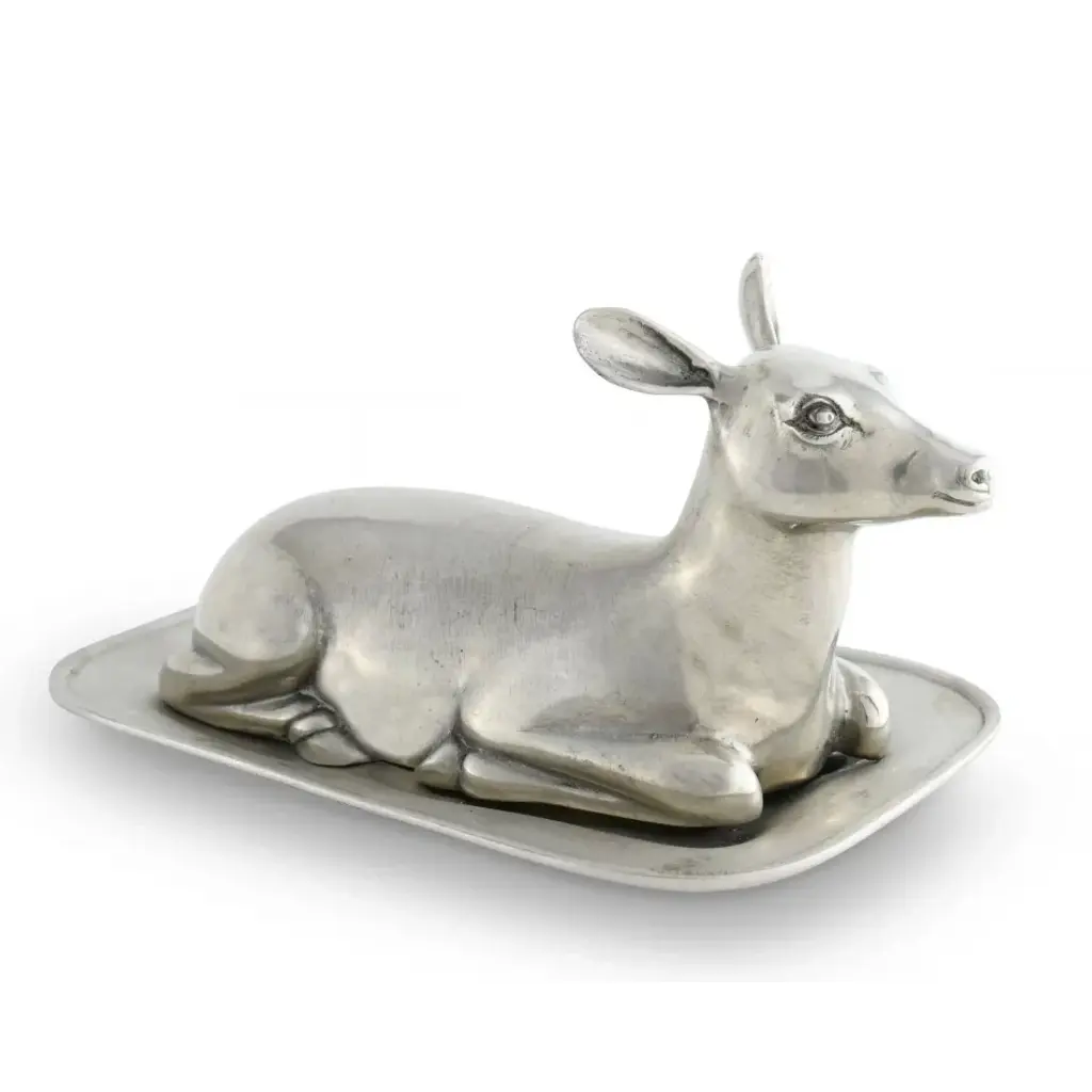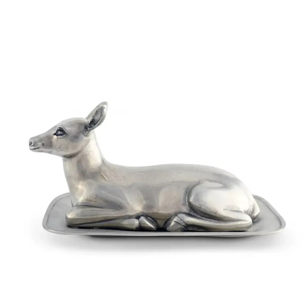 A gentle doe, crafted with beautiful detail with Vagabond House high quality pewter, peacefully rests on your table while providing cover for butter beneath her on a pewter plate. Our Vagabond House doe is a lovely, serene accent for your table with a practical advantage; the weight and coolness of the cast pewter doe ensures the freshness and shape of fine butter in a warm room or sunny day. Vagabond House is a family-owned American company specializing in fine pewter tableware, servingware and giftware. Largely inspired by nature, their exclusive products are designed to be unique, functional heirlooms for those who seek to express tradition and style in both family and formal entertaining.