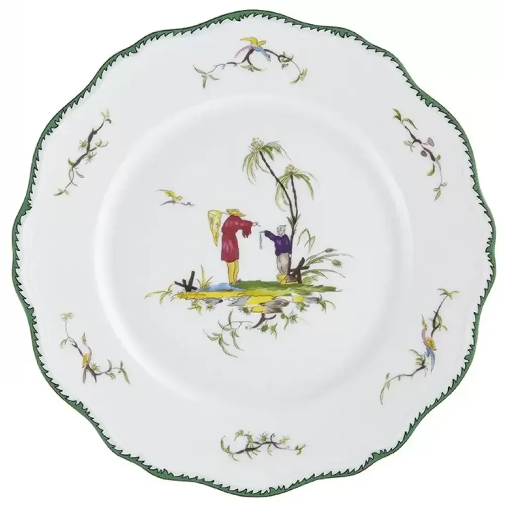 Longjiang is a perfect example of the Vieux Marseille design found on faience dinner services that were produced in the South of France in the 18th century. Chinese patterns were the latest fashion at the time, as Europeans went wild for the Orient and Eastern influences on the decorative arts. André Raynaud was a lover of antiques, and in 1974 he bought a faience plate with a design he admired. He later used it for his own porcelain—finer, more translucent and delicate than faience, making it possible to reproduce the designs and colours in strikingly meticulous detail. This service features six original pastoral scenes, available on all plates and cups, and depicting fishermen in an exotic setting. The rims of the plates are decorated with foliage and birds, and an elegant green trim. Today Raynaud is recreating this emblematic design in an Argent shape—an 18th-century scalloped edge which further enhances the design. Raynaud was established in 1849 and is the only survivor of 11 porcelain factories existing in Limoges, France. After years of research, Raynaud discovered techniques to create infinite combinations of fade-resistant decorations that is still used by porcelain makers. Boasting a client list of numerous presidents to Princess Diana, Raynaud has been the synonym of quality, known and recognized on every continent.