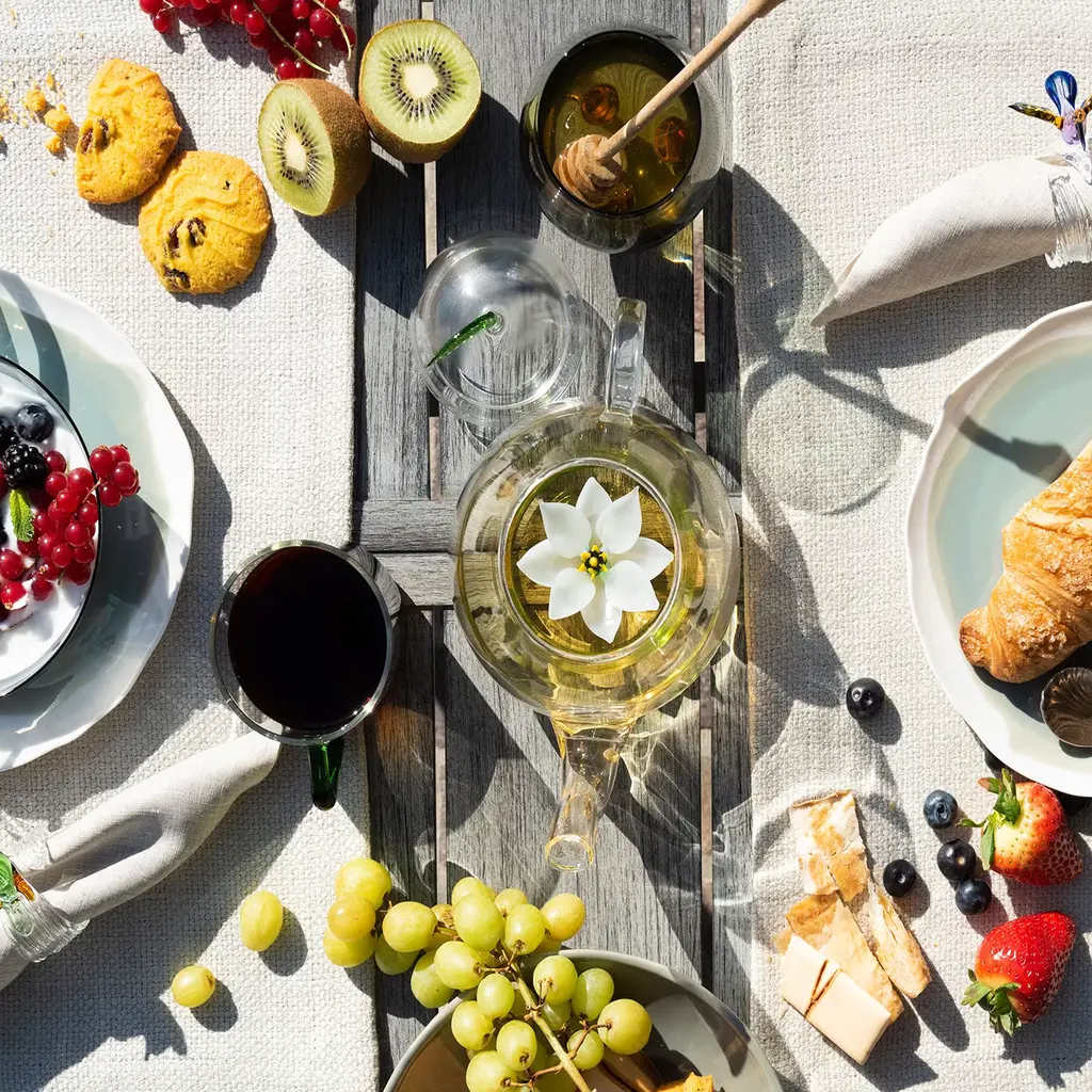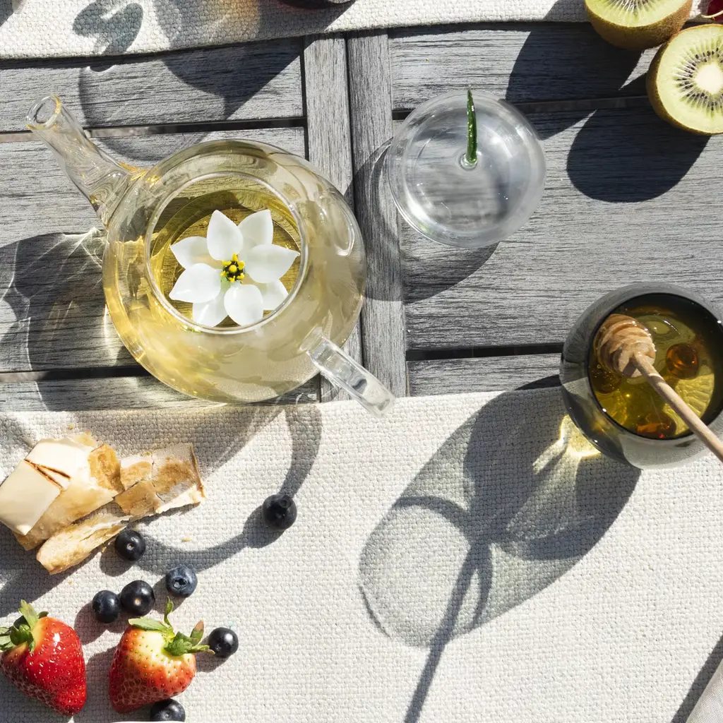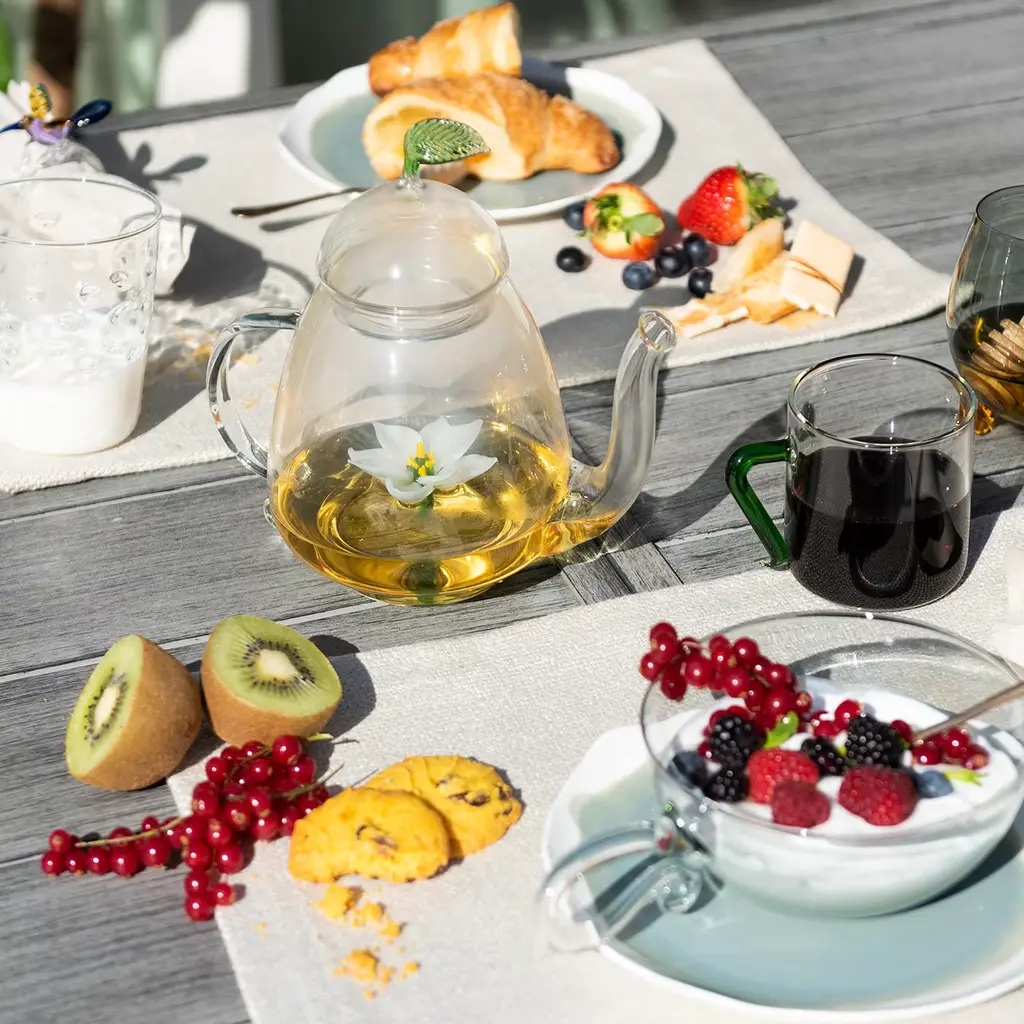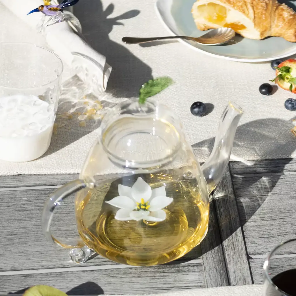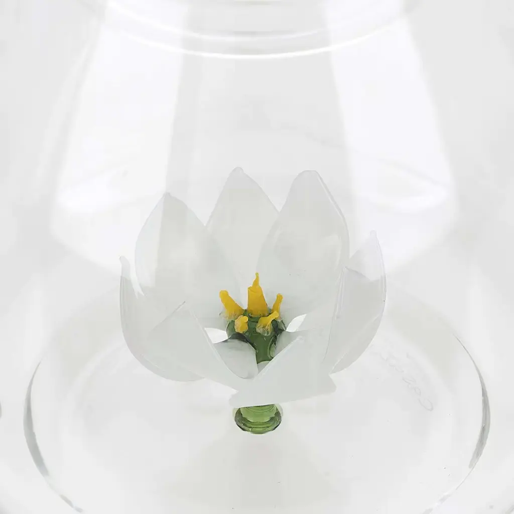 This magnificent teapot is a functional piece of art that will instantly add a charming and whimsical accent to any occasion. It was crafted by hand using transparent mouth-blown glass and features a simple silhouette with curved elements. The dome-shaped lid is topped with a green leaf, while inside the bowl a lotus flower opens its delicate white petals, revealing its golden heart. The pot holds four to five cups of tea.