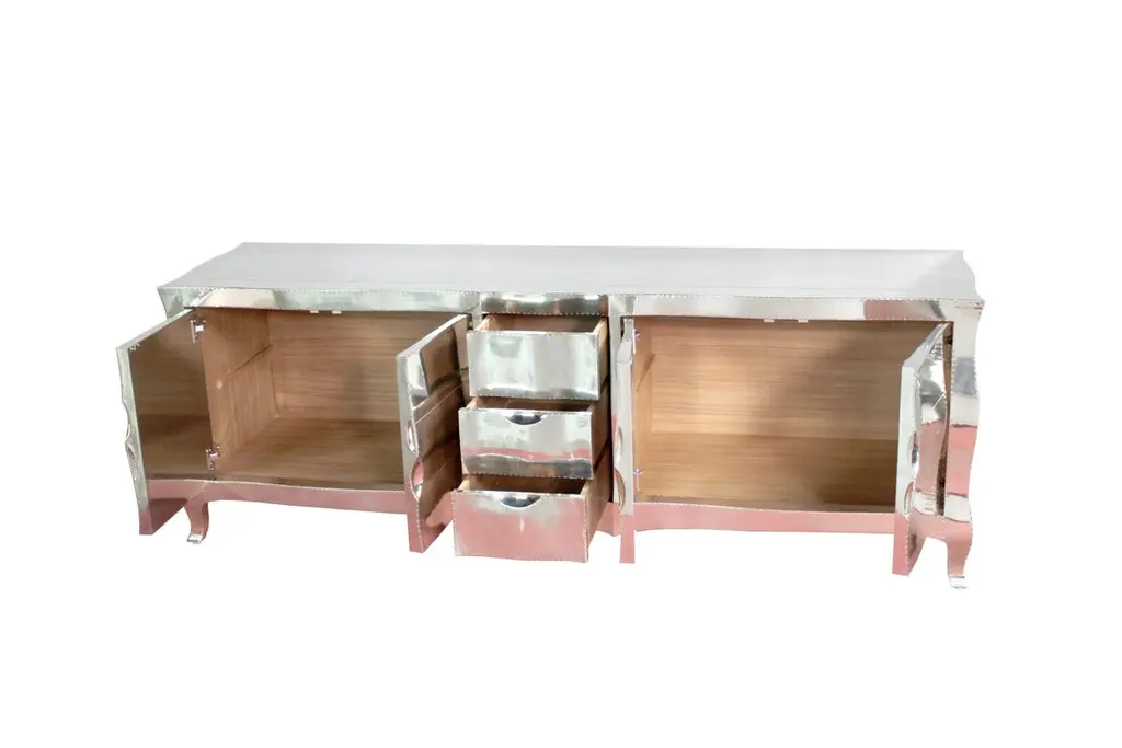 Louise Credenza from our Louise Collection. The renowned designer Paul Mathieu chose the name “Louise Credenza” when he created his more feminine version of Louis XV (1730-1760) furniture. The characteristic cabriole leg, curving outward at the knee and inward towards the foot in an "S" shape was born during this period. It is during the same era that English furniture makers produced the Queen Anne and Chippendale styles.Crafted with utmost care and attention to detail, these Louise Credenza are made to order and are available in twelve metal clad finishes, ensuring that you can choose the perfect one to match your individual style and taste. The use of high-quality materials and expert craftsmanship ensure that each Art Deco Louise Credenza is not only beautiful but also a true piece of Art.The curved legs and side arms of this Art Deco Louise Credenza are hand carved from solid pieces of teak. Pattern makers trace and cut complex forms that will cover the chair in a skin of copper, white bronze, brass or antiqued white bronze The metal finishes will tarnish over time. Regular non-abrasive household metal polishes can be used to restore the original luster.Overall, if you're looking for a piece of furniture that combines luxury, comfort, and style, then the Art Deco Louise Credenza is an excellent choice. With its distinctive curved profile and multiple finish options, this Chair set is sure to elevate the look of any room it is placed in, and be a beloved addition to your home for years to come.The images shown in this listing are shot in different lighting conditions and/or are 3D illustrations. We encourage our customers to please request a sample or a full sample set of 12 finishes so that they can experience the finish first hand. Louise Credenza Art Deco Cupboards in Fine Hammered Brass by Paul Mathieu for Stephanie OdegardSize- 78"L x 21"W x 30"HMaterials - Brass, Metal sheet, Teak, Wood, MetalTechniques: Hand-Crafted, Hand-Carved, Metal Work, Wood Work, Metal Wrapping, PolishedPlease note that moisture in air, sudden change in temperature and natural movement of wood over time causes the metal to wrinkle or bubble up. We use well seasoned, reclaimed teak and high quality marine grade MDF (wherever technically possible) to avoid and delay the mentioned changes. However a perfect stability of metal cannot be guaranteed. Please note that our smooth finish metal clad pieces will have some unavoidable tool marks. This is proof that everything is done by hand. The smooth finish will not come out like a machine made perfect surface and the master Artisan will do their best to make it look as good/clean/stable/perfect as he possibly can.The antique white bronze finish is hand done by using an acidic chemical over the white bronze finish to recreate a natural patination. Like with the natural patination of silver, copper, or brass, the final result and color uniformity of the patina cannot be guaranteed. The goal of this finish is to achieve rainbow-like shades with dull, shiny, cloudy, and streaky patches to give an illusion of antiquing. Please note:None of our metal clad pieces are treated with a protective “finish” thus enabling the items to age naturally over time. We will of course polish them well before we pack them. a) Copper oxidizes faster than the other metals. In six to twelve months it will most likely lose its shine and will gradually turn to different shades of brown and/or green/blue. This aging process and its effect is referred to as verdigris. After a year the piece should not change much more. Copper does not rust, but does require periodic cleaning in order to retain its original shine if that the preferred option. ('BRASSO' or any known copper polish can be used to polish copper).b) Brass retains its shine for far longer than others, but will tarnish if not cleaned on occasion. ('BRASSO' is made to polish brass).c) White bronze, has the least tendency to show age or tarnish. If kept in a controlled climate, this metal will hold its shine for years. It can be cleaned with a cleanser and polished with a cloth. d) The antiqued white bronze finish will react with the natural elements the fastest in the beginning but it too will stop reacting and will settle down in a stable state like copper after 6-12 months. Since it is already antiqued and looked like it is tarnished, as described in an earlier message, this fast reaction will not change the over all look. In that way this surface is most forgiving. The images shown in this listing are shot in different lighting conditions and/or are 3D illustrations. We encourage our customers to please request a sample or a full sample set of 12 finishes so that they can experience the finish first hand.