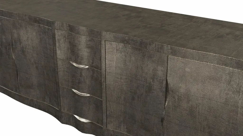Louise Credenza from our Louise Collection. The renowned designer Paul Mathieu chose the name “Louise Credenza” when he created his more feminine version of Louis XV (1730-1760) furniture. The characteristic cabriole leg, curving outward at the knee and inward towards the foot in an "S" shape was born during this period. It is during the same era that English furniture makers produced the Queen Anne and Chippendale styles.Crafted with utmost care and attention to detail, these Louise Credenza are made to order and are available in twelve metal clad finishes, ensuring that you can choose the perfect one to match your individual style and taste. The use of high-quality materials and expert craftsmanship ensure that each Art Deco Louise Credenza is not only beautiful but also a true piece of Art.The curved legs and side arms of this Art Deco Louise Credenza are hand carved from solid pieces of teak. Pattern makers trace and cut complex forms that will cover the chair in a skin of copper, white bronze, brass or antiqued white bronze The metal finishes will tarnish over time. Regular non-abrasive household metal polishes can be used to restore the original luster.Overall, if you're looking for a piece of furniture that combines luxury, comfort, and style, then the Art Deco Louise Credenza is an excellent choice. With its distinctive curved profile and multiple finish options, this Chair set is sure to elevate the look of any room it is placed in, and be a beloved addition to your home for years to come.The images shown in this listing are shot in different lighting conditions and/or are 3D illustrations. We encourage our customers to please request a sample or a full sample set of 12 finishes so that they can experience the finish first hand. Louise Credenza Art Deco Cupboards in Mid. Hammered Antique Bronze by Paul Mathieu for Stephanie OdegardSize- 78"L x 21"W x 30"HMaterials - Antique Bronze, Metal sheet, Teak, Wood, MetalTechniques: Hand-Crafted, Hand-Carved, Metal Work, Wood Work, Metal Wrapping, PolishedPlease note that moisture in air, sudden change in temperature and natural movement of wood over time causes the metal to wrinkle or bubble up. We use well seasoned, reclaimed teak and high quality marine grade MDF (wherever technically possible) to avoid and delay the mentioned changes. However a perfect stability of metal cannot be guaranteed. Please note that our smooth finish metal clad pieces will have some unavoidable tool marks. This is proof that everything is done by hand. The smooth finish will not come out like a machine made perfect surface and the master Artisan will do their best to make it look as good/clean/stable/perfect as he possibly can.The antique white bronze finish is hand done by using an acidic chemical over the white bronze finish to recreate a natural patination. Like with the natural patination of silver, copper, or brass, the final result and color uniformity of the patina cannot be guaranteed. The goal of this finish is to achieve rainbow-like shades with dull, shiny, cloudy, and streaky patches to give an illusion of antiquing. Please note:None of our metal clad pieces are treated with a protective “finish” thus enabling the items to age naturally over time. We will of course polish them well before we pack them. a) Copper oxidizes faster than the other metals. In six to twelve months it will most likely lose its shine and will gradually turn to different shades of brown and/or green/blue. This aging process and its effect is referred to as verdigris. After a year the piece should not change much more. Copper does not rust, but does require periodic cleaning in order to retain its original shine if that the preferred option. ('BRASSO' or any known copper polish can be used to polish copper).b) Brass retains its shine for far longer than others, but will tarnish if not cleaned on occasion. ('BRASSO' is made to polish brass).c) White bronze, has the least tendency to show age or tarnish. If kept in a controlled climate, this metal will hold its shine for years. It can be cleaned with a cleanser and polished with a cloth. d) The antiqued white bronze finish will react with the natural elements the fastest in the beginning but it too will stop reacting and will settle down in a stable state like copper after 6-12 months. Since it is already antiqued and looked like it is tarnished, as described in an earlier message, this fast reaction will not change the over all look. In that way this surface is most forgiving. The images shown in this listing are shot in different lighting conditions and/or are 3D illustrations. We encourage our customers to please request a sample or a full sample set of 12 finishes so that they can experience the finish first hand.