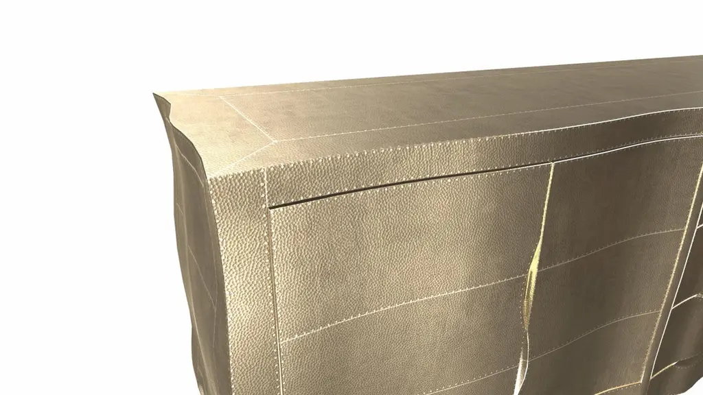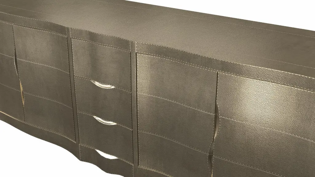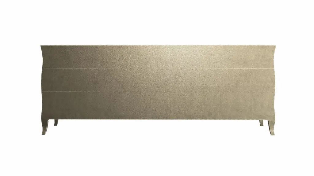 Louise Credenza from our Louise Collection. The renowned designer Paul Mathieu chose the name “Louise Credenza” when he created his more feminine version of Louis XV (1730-1760) furniture. The characteristic cabriole leg, curving outward at the knee and inward towards the foot in an "S" shape was born during this period. It is during the same era that English furniture makers produced the Queen Anne and Chippendale styles.Crafted with utmost care and attention to detail, these Louise Credenza are made to order and are available in twelve metal clad finishes, ensuring that you can choose the perfect one to match your individual style and taste. The use of high-quality materials and expert craftsmanship ensure that each Art Deco Louise Credenza is not only beautiful but also a true piece of Art.The curved legs and side arms of this Art Deco Louise Credenza are hand carved from solid pieces of teak. Pattern makers trace and cut complex forms that will cover the chair in a skin of copper, white bronze, brass or antiqued white bronze The metal finishes will tarnish over time. Regular non-abrasive household metal polishes can be used to restore the original luster.Overall, if you're looking for a piece of furniture that combines luxury, comfort, and style, then the Art Deco Louise Credenza is an excellent choice. With its distinctive curved profile and multiple finish options, this Chair set is sure to elevate the look of any room it is placed in, and be a beloved addition to your home for years to come.The images shown in this listing are shot in different lighting conditions and/or are 3D illustrations. We encourage our customers to please request a sample or a full sample set of 12 finishes so that they can experience the finish first hand. Louise Credenza Art Deco Cupboards in Mid. Hammered Brass by Paul Mathieu for Stephanie OdegardSize- 78"L x 21"W x 30"HMaterials - Brass, Metal sheet, Teak, Wood, MetalTechniques: Hand-Crafted, Hand-Carved, Metal Work, Wood Work, Metal Wrapping, PolishedPlease note that moisture in air, sudden change in temperature and natural movement of wood over time causes the metal to wrinkle or bubble up. We use well seasoned, reclaimed teak and high quality marine grade MDF (wherever technically possible) to avoid and delay the mentioned changes. However a perfect stability of metal cannot be guaranteed. Please note that our smooth finish metal clad pieces will have some unavoidable tool marks. This is proof that everything is done by hand. The smooth finish will not come out like a machine made perfect surface and the master Artisan will do their best to make it look as good/clean/stable/perfect as he possibly can.The antique white bronze finish is hand done by using an acidic chemical over the white bronze finish to recreate a natural patination. Like with the natural patination of silver, copper, or brass, the final result and color uniformity of the patina cannot be guaranteed. The goal of this finish is to achieve rainbow-like shades with dull, shiny, cloudy, and streaky patches to give an illusion of antiquing. Please note:None of our metal clad pieces are treated with a protective “finish” thus enabling the items to age naturally over time. We will of course polish them well before we pack them. a) Copper oxidizes faster than the other metals. In six to twelve months it will most likely lose its shine and will gradually turn to different shades of brown and/or green/blue. This aging process and its effect is referred to as verdigris. After a year the piece should not change much more. Copper does not rust, but does require periodic cleaning in order to retain its original shine if that the preferred option. ('BRASSO' or any known copper polish can be used to polish copper).b) Brass retains its shine for far longer than others, but will tarnish if not cleaned on occasion. ('BRASSO' is made to polish brass).c) White bronze, has the least tendency to show age or tarnish. If kept in a controlled climate, this metal will hold its shine for years. It can be cleaned with a cleanser and polished with a cloth. d) The antiqued white bronze finish will react with the natural elements the fastest in the beginning but it too will stop reacting and will settle down in a stable state like copper after 6-12 months. Since it is already antiqued and looked like it is tarnished, as described in an earlier message, this fast reaction will not change the over all look. In that way this surface is most forgiving. The images shown in this listing are shot in different lighting conditions and/or are 3D illustrations. We encourage our customers to please request a sample or a full sample set of 12 finishes so that they can experience the finish first hand.