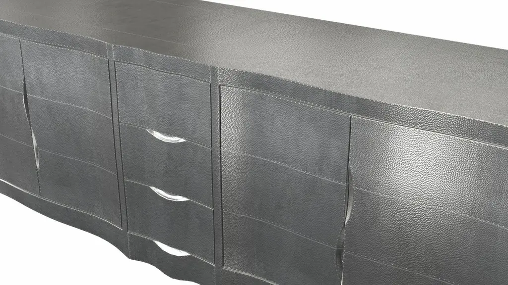 Louise Credenza from our Louise Collection. The renowned designer Paul Mathieu chose the name “Louise Credenza” when he created his more feminine version of Louis XV (1730-1760) furniture. The characteristic cabriole leg, curving outward at the knee and inward towards the foot in an "S" shape was born during this period. It is during the same era that English furniture makers produced the Queen Anne and Chippendale styles.Crafted with utmost care and attention to detail, these Louise Credenza are made to order and are available in twelve metal clad finishes, ensuring that you can choose the perfect one to match your individual style and taste. The use of high-quality materials and expert craftsmanship ensure that each Art Deco Louise Credenza is not only beautiful but also a true piece of Art.The curved legs and side arms of this Art Deco Louise Credenza are hand carved from solid pieces of teak. Pattern makers trace and cut complex forms that will cover the chair in a skin of copper, white bronze, brass or antiqued white bronze The metal finishes will tarnish over time. Regular non-abrasive household metal polishes can be used to restore the original luster.Overall, if you're looking for a piece of furniture that combines luxury, comfort, and style, then the Art Deco Louise Credenza is an excellent choice. With its distinctive curved profile and multiple finish options, this Chair set is sure to elevate the look of any room it is placed in, and be a beloved addition to your home for years to come.The images shown in this listing are shot in different lighting conditions and/or are 3D illustrations. We encourage our customers to please request a sample or a full sample set of 12 finishes so that they can experience the finish first hand. Louise Credenza Art Deco Cupboards in Mid. Hammered White Bronze by Paul Mathieu for Stephanie OdegardSize- 78"L x 21"W x 30"HMaterials - White Bronze, Metal sheet, Teak, Wood, MetalTechniques: Hand-Crafted, Hand-Carved, Metal Work, Wood Work, Metal Wrapping, PolishedPlease note that moisture in air, sudden change in temperature and natural movement of wood over time causes the metal to wrinkle or bubble up. We use well seasoned, reclaimed teak and high quality marine grade MDF (wherever technically possible) to avoid and delay the mentioned changes. However a perfect stability of metal cannot be guaranteed. Please note that our smooth finish metal clad pieces will have some unavoidable tool marks. This is proof that everything is done by hand. The smooth finish will not come out like a machine made perfect surface and the master Artisan will do their best to make it look as good/clean/stable/perfect as he possibly can.The antique white bronze finish is hand done by using an acidic chemical over the white bronze finish to recreate a natural patination. Like with the natural patination of silver, copper, or brass, the final result and color uniformity of the patina cannot be guaranteed. The goal of this finish is to achieve rainbow-like shades with dull, shiny, cloudy, and streaky patches to give an illusion of antiquing. Please note:None of our metal clad pieces are treated with a protective “finish” thus enabling the items to age naturally over time. We will of course polish them well before we pack them. a) Copper oxidizes faster than the other metals. In six to twelve months it will most likely lose its shine and will gradually turn to different shades of brown and/or green/blue. This aging process and its effect is referred to as verdigris. After a year the piece should not change much more. Copper does not rust, but does require periodic cleaning in order to retain its original shine if that the preferred option. ('BRASSO' or any known copper polish can be used to polish copper).b) Brass retains its shine for far longer than others, but will tarnish if not cleaned on occasion. ('BRASSO' is made to polish brass).c) White bronze, has the least tendency to show age or tarnish. If kept in a controlled climate, this metal will hold its shine for years. It can be cleaned with a cleanser and polished with a cloth. d) The antiqued white bronze finish will react with the natural elements the fastest in the beginning but it too will stop reacting and will settle down in a stable state like copper after 6-12 months. Since it is already antiqued and looked like it is tarnished, as described in an earlier message, this fast reaction will not change the over all look. In that way this surface is most forgiving. The images shown in this listing are shot in different lighting conditions and/or are 3D illustrations. We encourage our customers to please request a sample or a full sample set of 12 finishes so that they can experience the finish first hand.