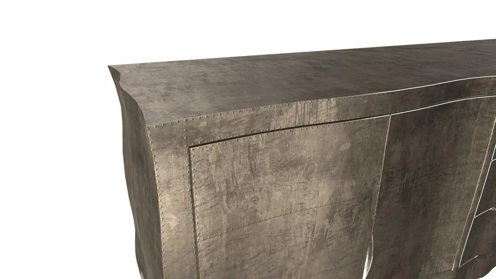 Louise Credenza from our Louise Collection. The renowned designer Paul Mathieu chose the name “Louise Credenza” when he created his more feminine version of Louis XV (1730-1760) furniture. The characteristic cabriole leg, curving outward at the knee and inward towards the foot in an "S" shape was born during this period. It is during the same era that English furniture makers produced the Queen Anne and Chippendale styles.Crafted with utmost care and attention to detail, these Louise Credenza are made to order and are available in twelve metal clad finishes, ensuring that you can choose the perfect one to match your individual style and taste. The use of high-quality materials and expert craftsmanship ensure that each Art Deco Louise Credenza is not only beautiful but also a true piece of Art.The curved legs and side arms of this Art Deco Louise Credenza are hand carved from solid pieces of teak. Pattern makers trace and cut complex forms that will cover the chair in a skin of copper, white bronze, brass or antiqued white bronze The metal finishes will tarnish over time. Regular non-abrasive household metal polishes can be used to restore the original luster.Overall, if you're looking for a piece of furniture that combines luxury, comfort, and style, then the Art Deco Louise Credenza is an excellent choice. With its distinctive curved profile and multiple finish options, this Chair set is sure to elevate the look of any room it is placed in, and be a beloved addition to your home for years to come.The images shown in this listing are shot in different lighting conditions and/or are 3D illustrations. We encourage our customers to please request a sample or a full sample set of 12 finishes so that they can experience the finish first hand. Louise Credenza Art Deco Cupboards in Smooth Antique Bronze by Paul Mathieu for Stephanie OdegardSize- 78"L x 21"W x 30"HMaterials - Antique Bronze, Metal sheet, Teak, Wood, MetalTechniques: Hand-Crafted, Hand-Carved, Metal Work, Wood Work, Metal Wrapping, PolishedPlease note that moisture in air, sudden change in temperature and natural movement of wood over time causes the metal to wrinkle or bubble up. We use well seasoned, reclaimed teak and high quality marine grade MDF (wherever technically possible) to avoid and delay the mentioned changes. However a perfect stability of metal cannot be guaranteed. Please note that our smooth finish metal clad pieces will have some unavoidable tool marks. This is proof that everything is done by hand. The smooth finish will not come out like a machine made perfect surface and the master Artisan will do their best to make it look as good/clean/stable/perfect as he possibly can.The antique white bronze finish is hand done by using an acidic chemical over the white bronze finish to recreate a natural patination. Like with the natural patination of silver, copper, or brass, the final result and color uniformity of the patina cannot be guaranteed. The goal of this finish is to achieve rainbow-like shades with dull, shiny, cloudy, and streaky patches to give an illusion of antiquing. Please note:None of our metal clad pieces are treated with a protective “finish” thus enabling the items to age naturally over time. We will of course polish them well before we pack them. a) Copper oxidizes faster than the other metals. In six to twelve months it will most likely lose its shine and will gradually turn to different shades of brown and/or green/blue. This aging process and its effect is referred to as verdigris. After a year the piece should not change much more. Copper does not rust, but does require periodic cleaning in order to retain its original shine if that the preferred option. ('BRASSO' or any known copper polish can be used to polish copper).b) Brass retains its shine for far longer than others, but will tarnish if not cleaned on occasion. ('BRASSO' is made to polish brass).c) White bronze, has the least tendency to show age or tarnish. If kept in a controlled climate, this metal will hold its shine for years. It can be cleaned with a cleanser and polished with a cloth. d) The antiqued white bronze finish will react with the natural elements the fastest in the beginning but it too will stop reacting and will settle down in a stable state like copper after 6-12 months. Since it is already antiqued and looked like it is tarnished, as described in an earlier message, this fast reaction will not change the over all look. In that way this surface is most forgiving. The images shown in this listing are shot in different lighting conditions and/or are 3D illustrations. We encourage our customers to please request a sample or a full sample set of 12 finishes so that they can experience the finish first hand.