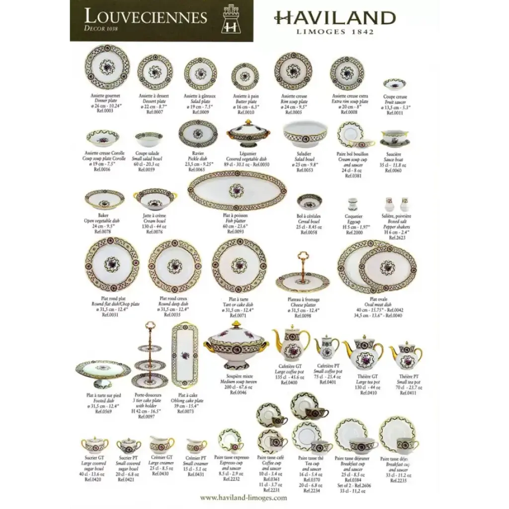 Delicate roses and vines adorn the border of this classic dinnerware collection from Haviland. 5-Piece Place setting includes Dinner plate, Dessert Plate, Bread & Butter Plate, Tea cup & Tea Saucer. Haviland Porcelain was founded by David Haviland, an American who moved from New York to France after he was brought a broken tea cup to match and recognized the quality and color of the old piece of porcelain. Filled with curiosity, he went to France to find the factory where the cup had been made, but the samples he was sent were not up to his standards. So in 1841, he moved to Limoges to set up his own factory. Traditional French dinnerware was usually produced in Limoges and sent to Paris for decoration. Haviland insisted on setting up a studio within his factory to have more control over the designs. Renowned artists, including Cocteau, Dali, and Kandinsky have played a role in the company's designs. Today, Haviland is one of the premier names in French porcelain dinnerware, sought by collectors all over the world. Clients have included the White House, Empress Eugenie, General de Gaulle, Jacques Chirac, the Emperor of Japan, and the Royal Court of Morocco.