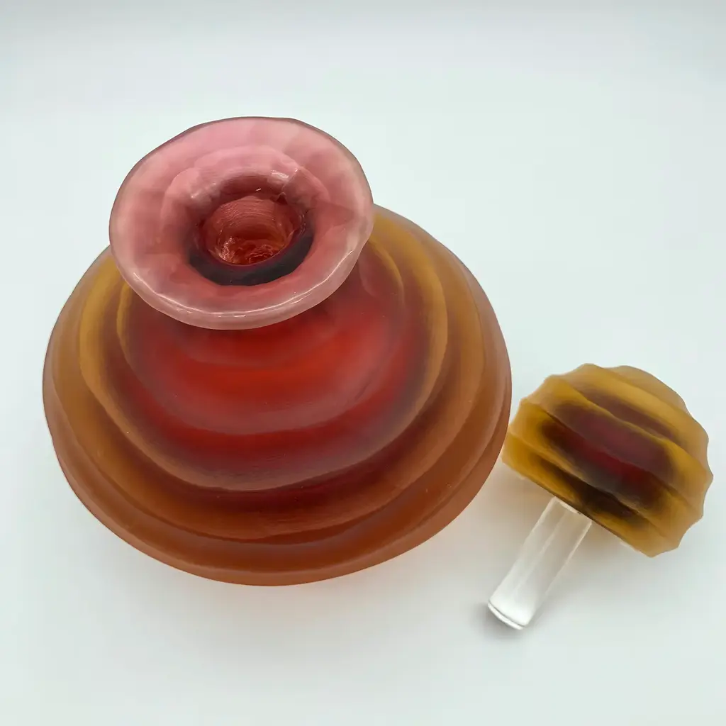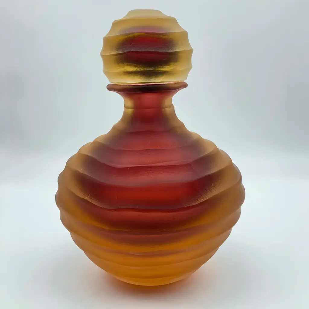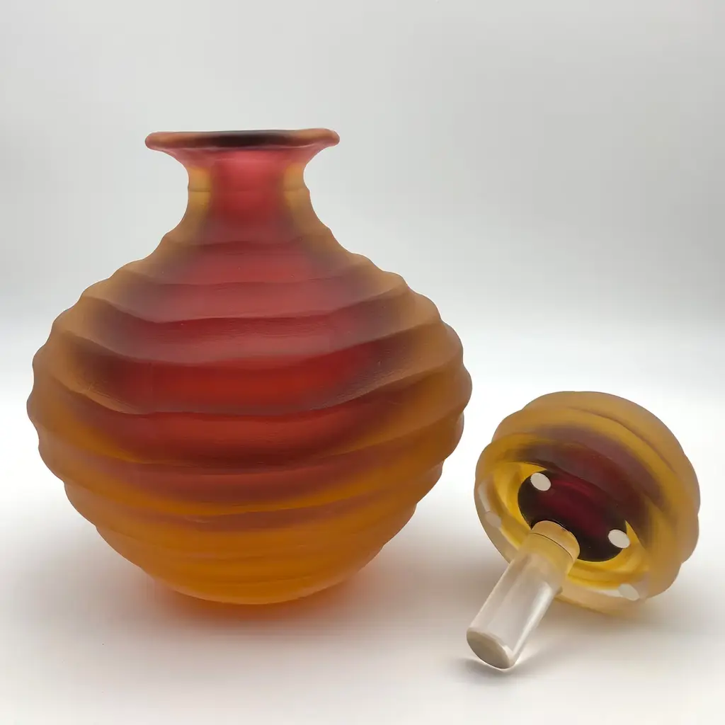 An alluring objet d'art that doubles as a practical bottle with lid for serving cool water or soft drink, this exquisite design is deftly handcrafted by master glassblower Achille D'Este and carved by hand by artisan Renzo Vianello. A symbol of Ars Murano's artistic repertoire, its warm amber-and-ruby hue is graced with an uneven ribbed pattern.