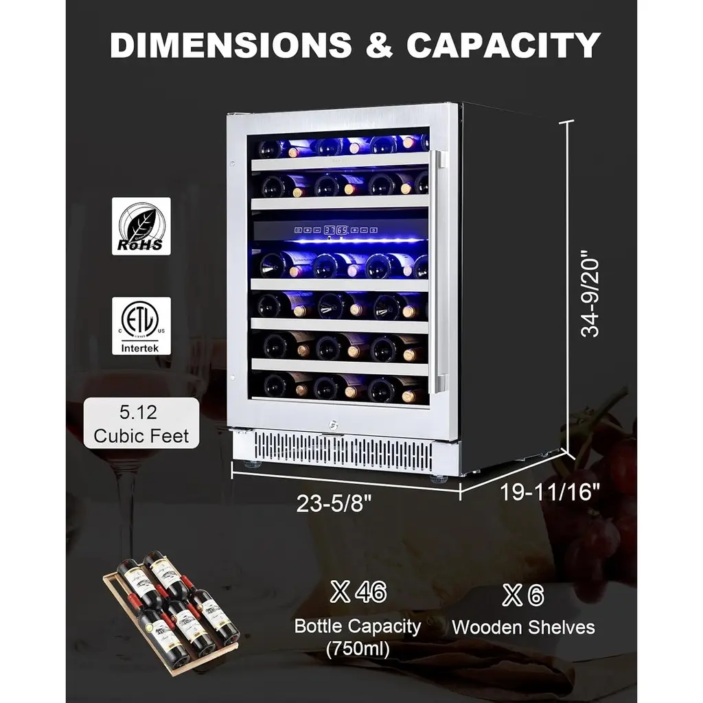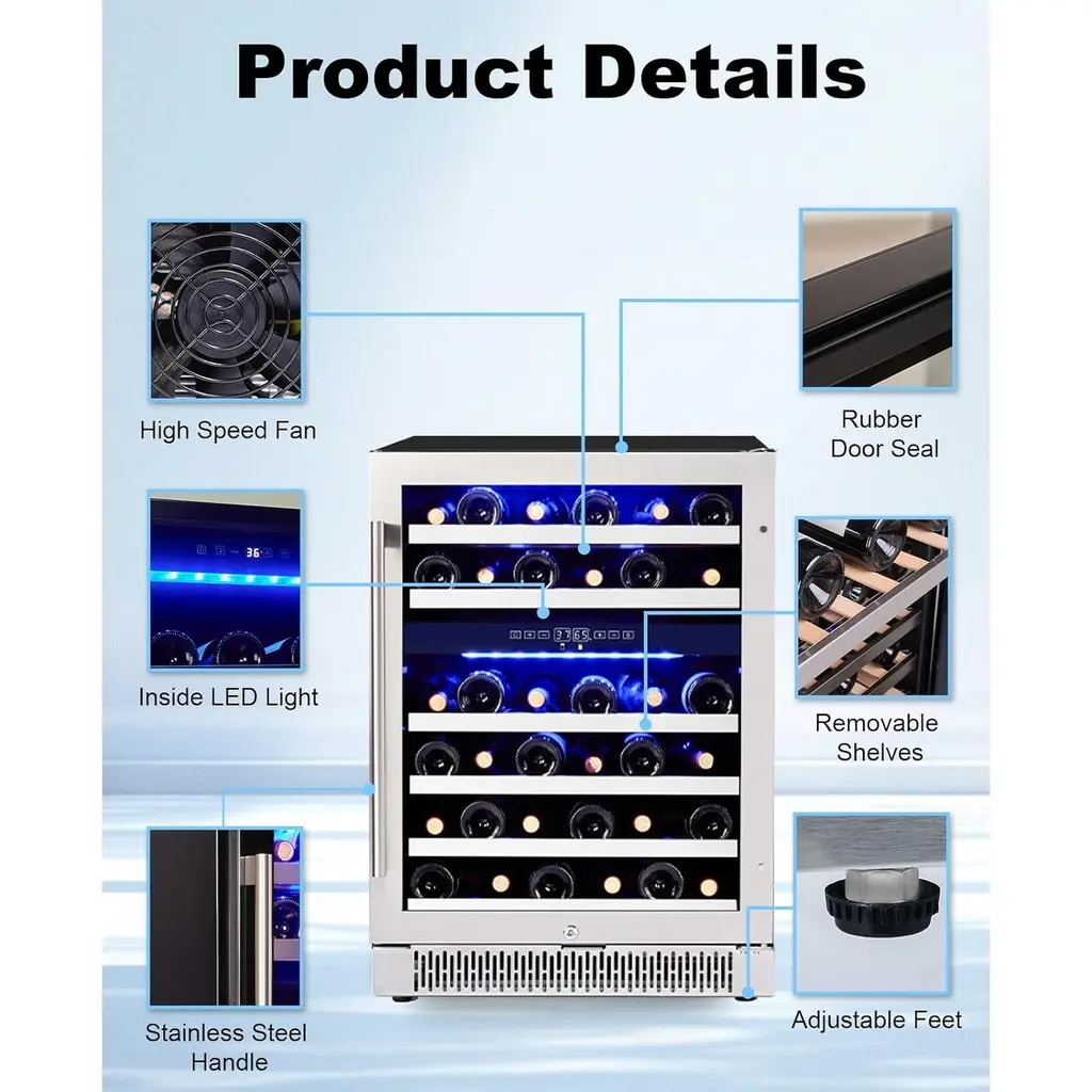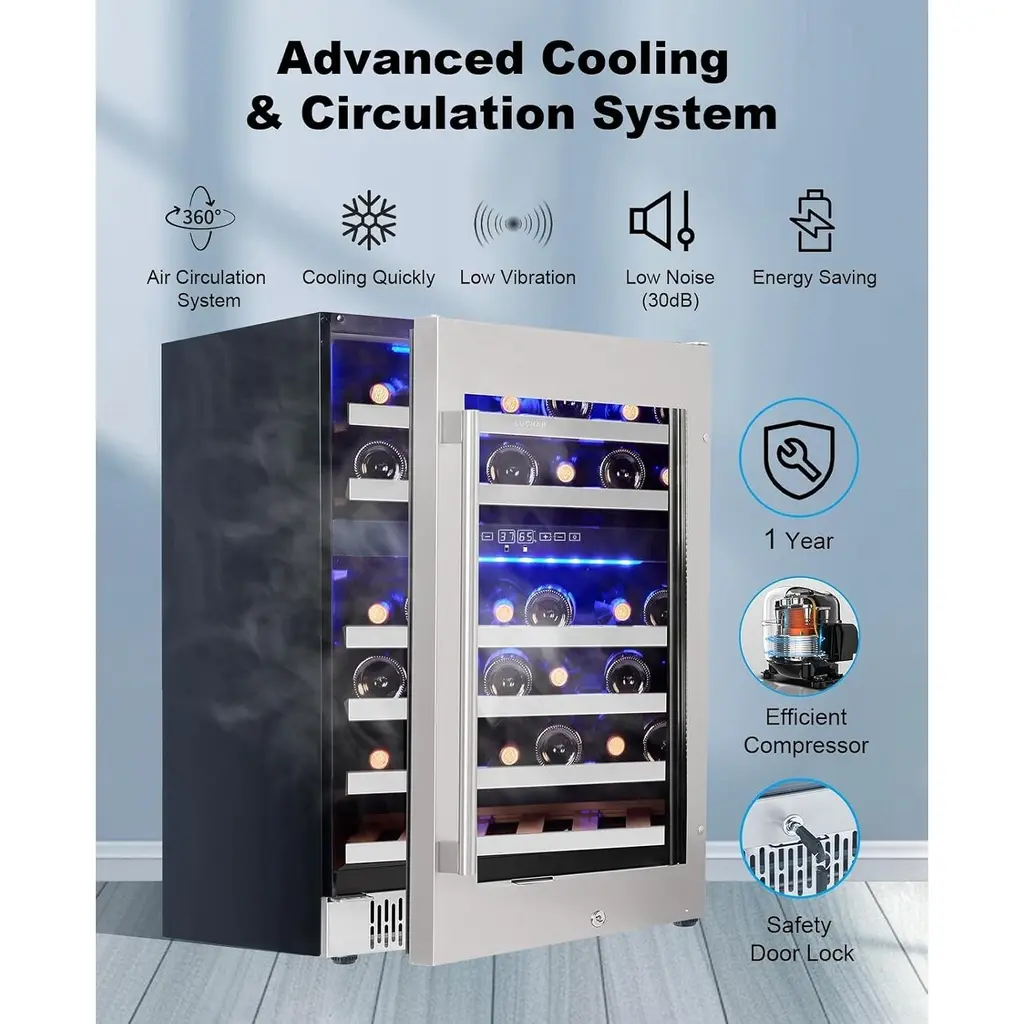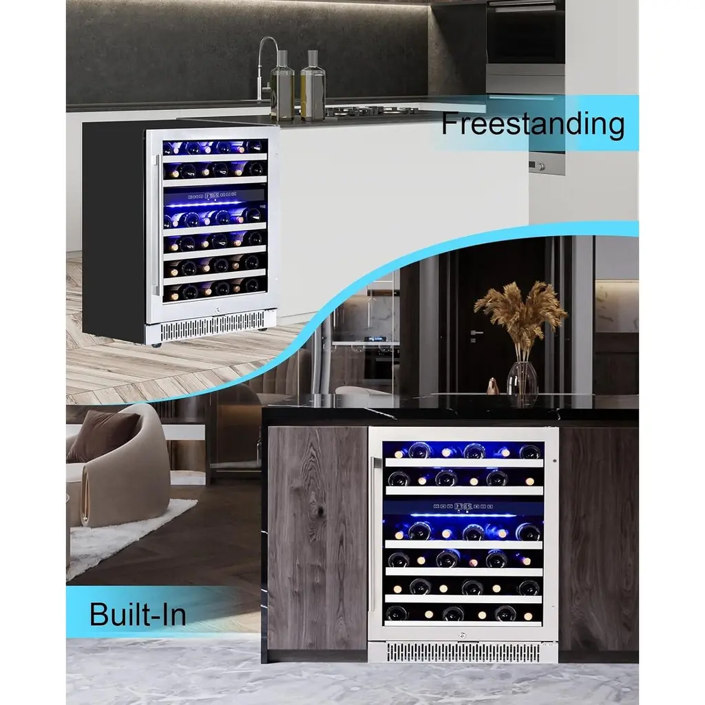DUAL ZONE MEMORY TEMPERATURE CONTROL: With an advanced dual zone cooling system, the precise and adjustable temperature of 37-65℉ is customized for each bottle of wine to maintain the flavor of the wine. And mini fridge features a temperature memory function that allows after power failure to be restored to the original set temperature, guaranteeing that every sip is as delightful as the first. Enjoy peace of mind with our advanced bar fridge tailored for perfect preservation. LARGE CAPACITY: The size of the wine fridge dual zone is 23.4'' (W) x 22.4'' (D) x32.3'' (H), 5.12 cu.ft. It is equipped with 6 layers movable wooden shelves. The mini wine cabinet can hold at least 36 bottles of wine (750 ml), which can meet the needs of party and home wine storage. Easy to install, can be placed under the cabinet as a wine fridge under counter, or placed independently in any indoor area, suitable for home kitchen, bar or office, etc. TOUCHSCREEN CONTROLS AND SAFETY LOCK: Easily adjust temperature and lighting through a digital touchscreen panel, and energy-efficient LED lights can emit 3 mild colors(Blue/Yellow/White). Saying goodbye to harsh fluorescent lights that fade labels. The stainless steel door handle is effective against fingerprints and rust. The wine cellar comes with a safety lock to protect your collection when needed and prevent children from drinking it. REVERSIBLE DUAL UV-RESISTANT GLASS DOOR: The wine cooler refrigerator with dual anti-UV glass door design can effectively insulates against external temperature fluctuations, and can prevent harmful UV rays that will break down the bolder and special flavor of red wine. Also equipped with automatic defrosting function and activated carbon filtration system to ensure odor-free storage. We also designed the hidden door hinge, so you can freely choose the door orientation according to your needs. EFFICIENT AND QUIET COOLING SYSTEM: Wine refrigerator with energy-saving compressor, 42dB operation. The wine fan distribute cool air evenly to every corner of the cooler, and the highly flexible and sturdy sealing door makes it more suitable for cooling. The unique vibration absorption system reduces noise and vibration. Let the small wine fridge stand upright for 24-36 hours before powering on. Our support team is available 24/7 to assist you with installation and troubleshooting.