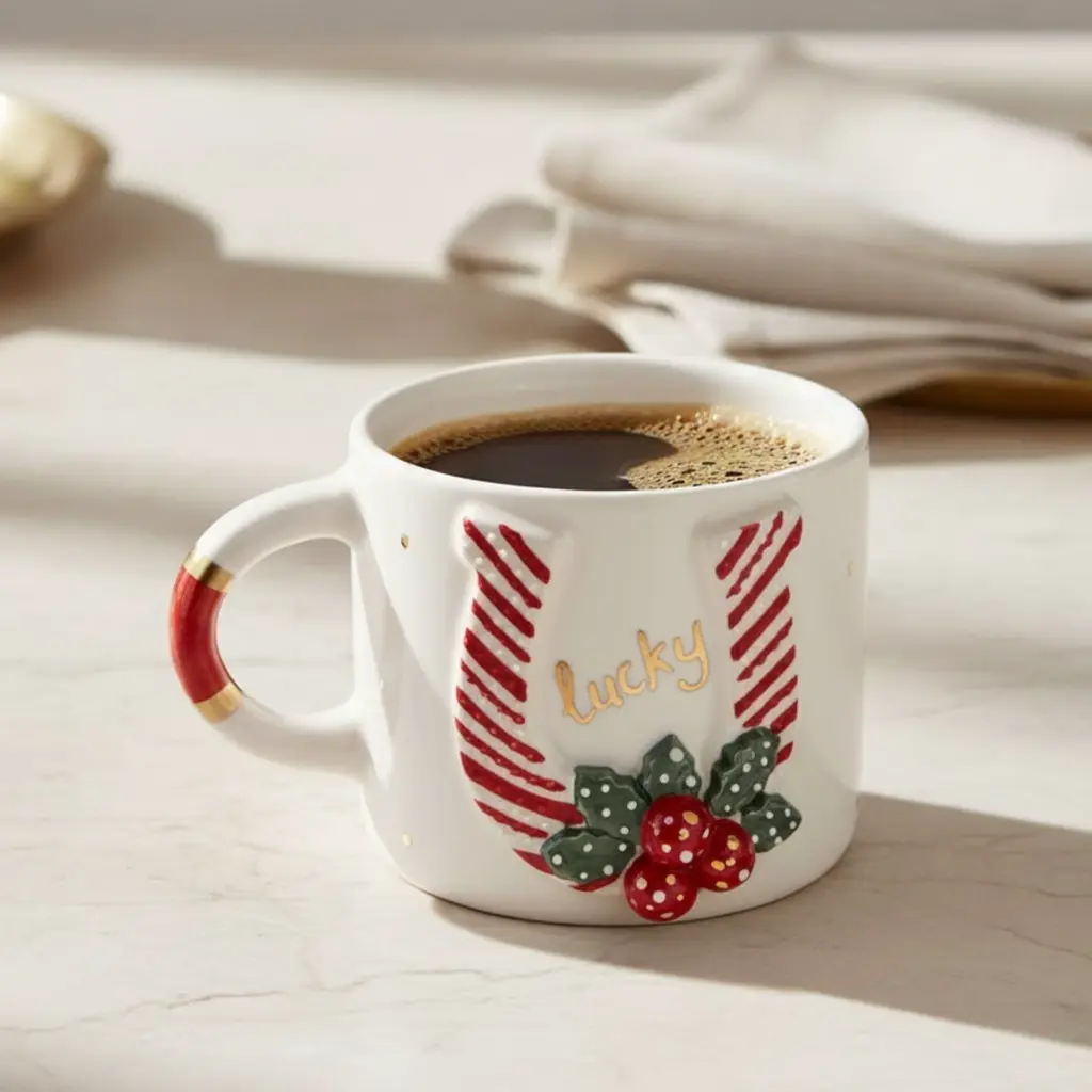 Add a touch of festive fortune to your daily ritual with this exquisite handcrafted ceramic mug, featuring a charming horseshoe design embellished with real 24ct gold accents. The word "Lucky" is delicately inscribed in gold, while the candy-cane striped horseshoe and festive holly berries bring a joyful, holiday feel. The handle, finished with gleaming gold detailing, adds an elegant flair to this unique piece. Perfect for enjoying your favorite warm beverages, this artisanal mug combines playful charm with a hint of luxury, making it an ideal seasonal gift or a beautiful addition to your holiday collection.