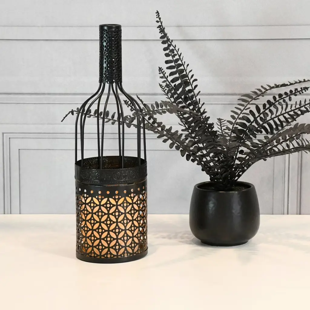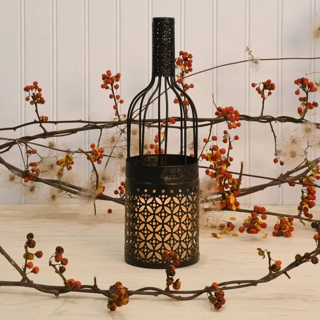 This trendy metal lantern in the design of a bottle with an LED candle is a versatile piece perfect for a special occasion or everyday home décor. Brighten up any area of your home by incorporating this delightful lantern into your decorating. The 3″ flameless resin candle with a timer for 5 hours on and 19 hours off casts a warm amber glow. It's a perfect accent piece for your coffee table, seating areas, centerpieces, and so much more. Candle requires 3 AAA batteries (not included).
