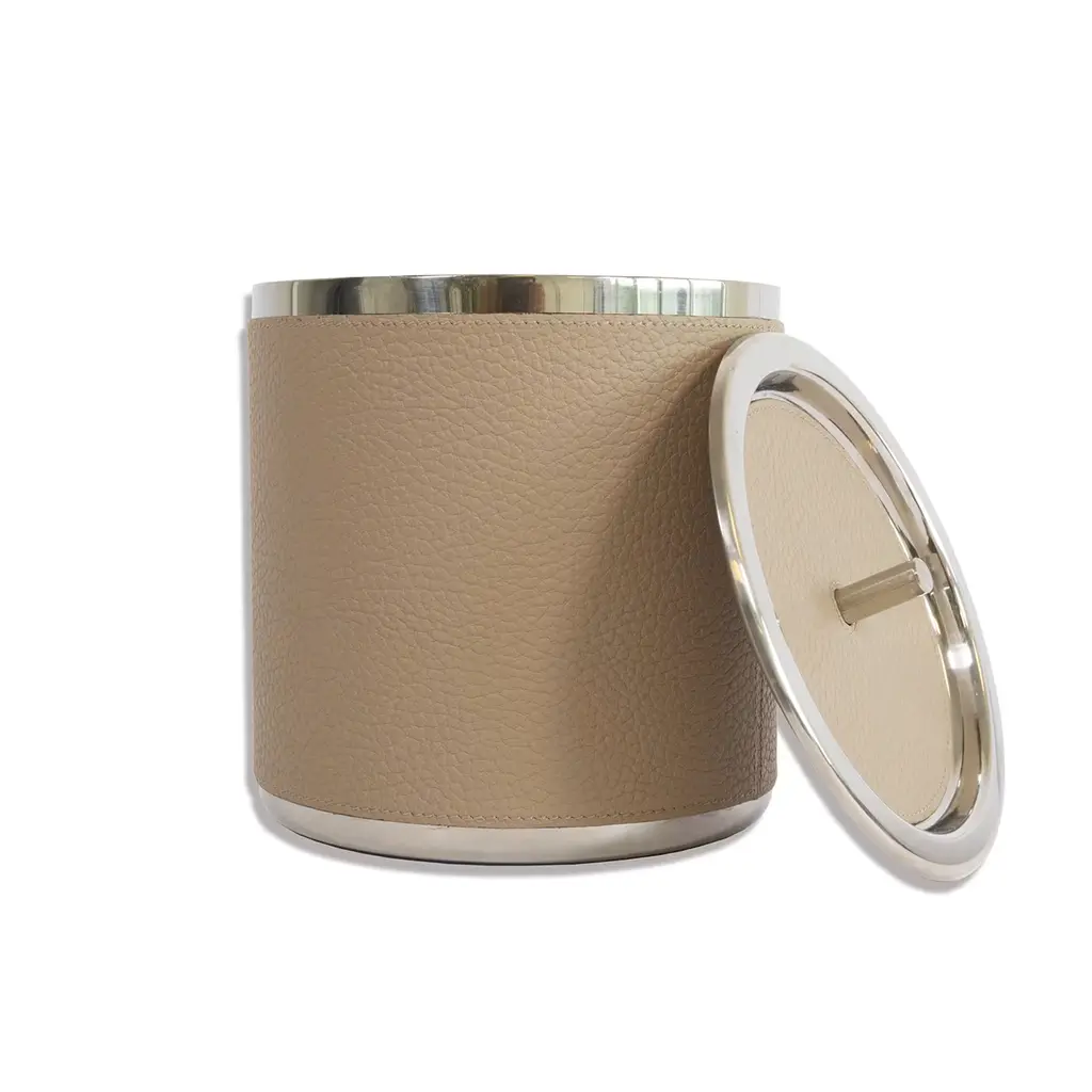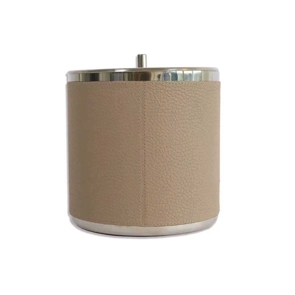 This small yet iconic ice bucket from the Machiavelli series of precious designs will make an elegant addition during a special date. Fashioned of stainless steel, it is entirely covered by hand with soft and fine genuine full-grain leather, rendered in a beige tone. Available in 13 different colors upon choice or decor need, please consult the Artemest catalog for details.