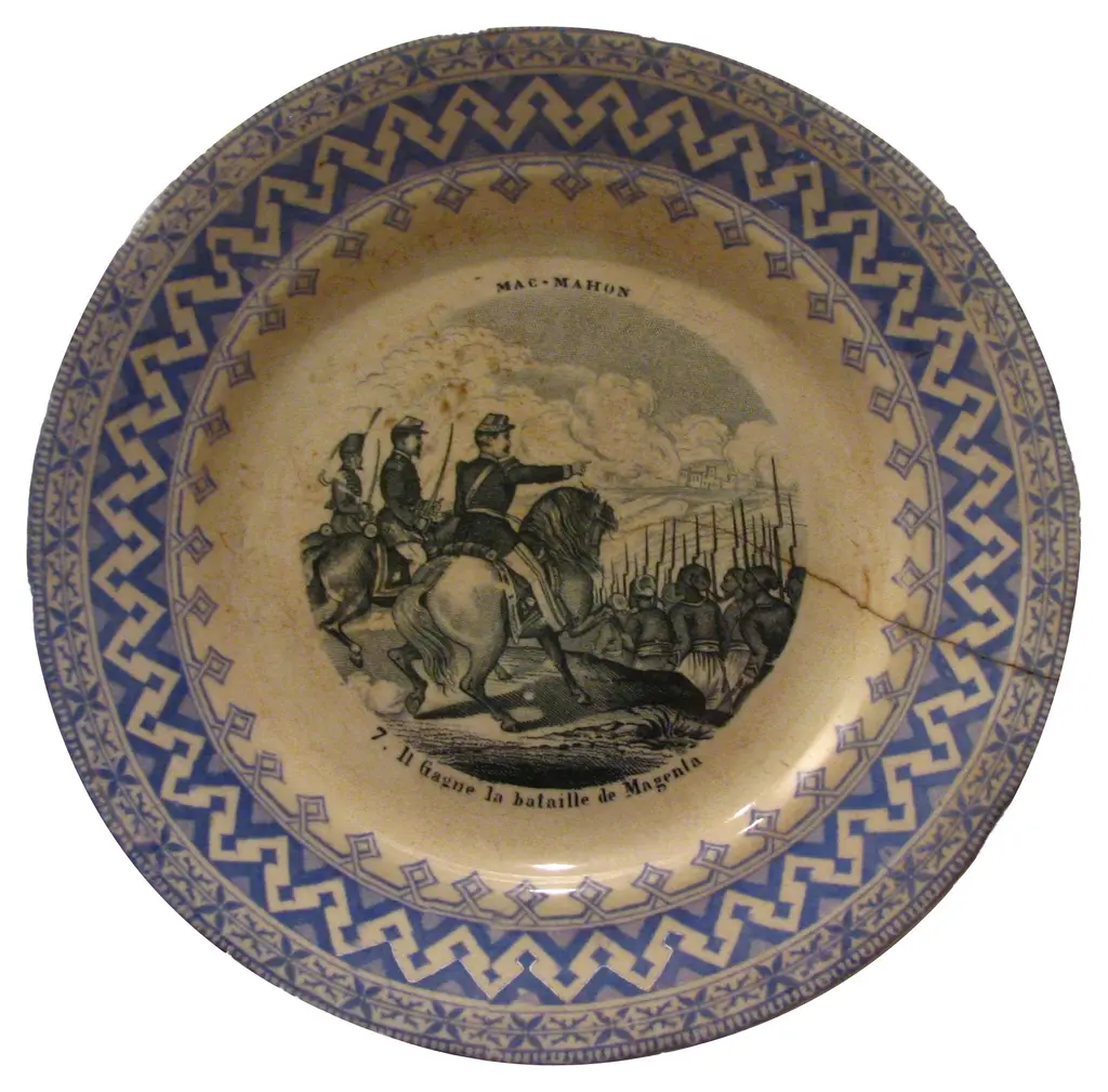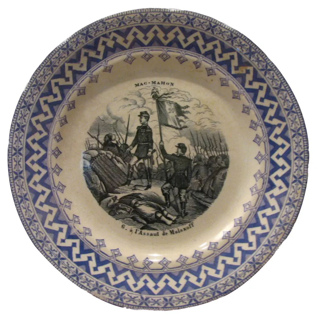 Pair of antique plates commemorating the 1855 Crimean War battles at Malakoff and Napoleon III's 1859 Second Italian War for Independence ventures. Features Patrice de MacMahon, of an aristocratic Franco-Irish family, later Duke of Magenta and second President of the French Republic. Incised late-19th-century mark of HB Choisy le Roi en verso. Age discoloration; one crack.