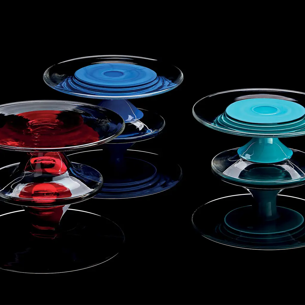 The simple yet sophisticated retro-style Madeleine cake stand is to miniature pastries what a pedestal is to a sculpture. Entirely made in mouth-blown Murano crystal glass with a drop of green teal color in the center, this piece is ideal for catering or showcasing your desserts at home in style.