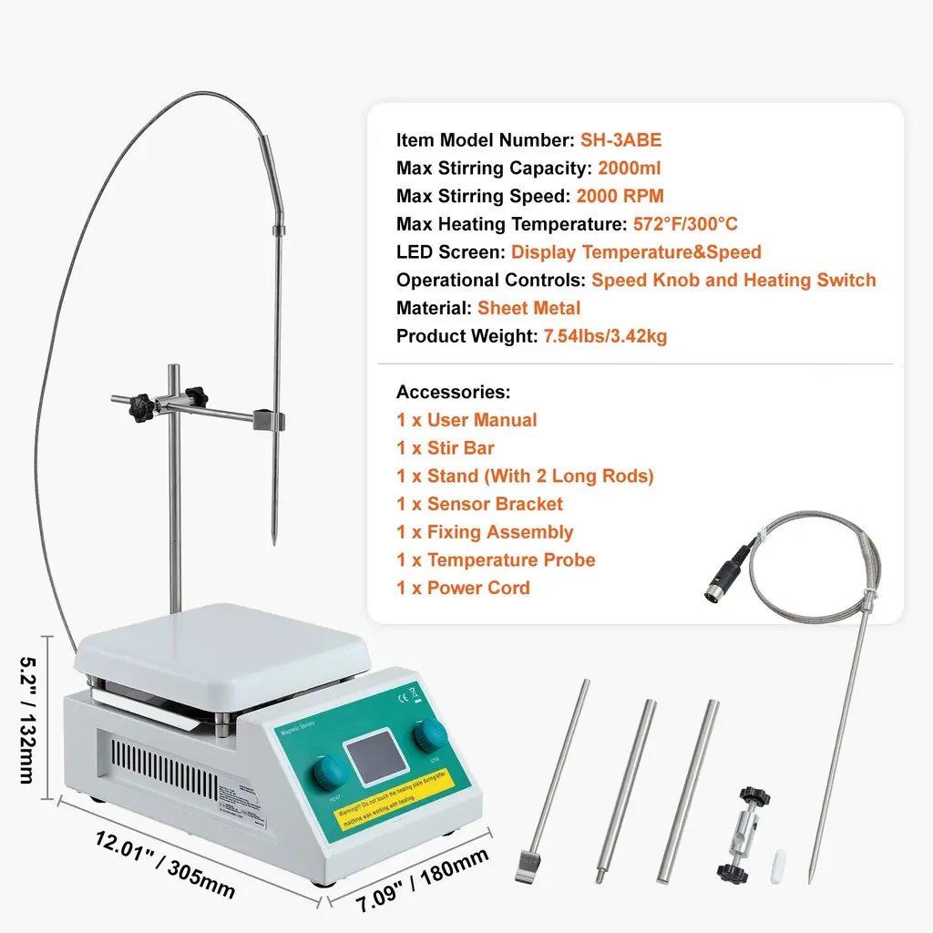 Adjustable Stirring Speed: For green option : With a max stirring capacity of 2000ml and a max stirring speed of 2000 RPM. For blue/white option: With a max stirring capacity of 3000ml and a max stirring speed of 2000 RPM. Our magnetic stirrer features a bottom heating plate with an adjustable speed design. Rotate clockwise to increase the stirring speed and counterclockwise to reduce it. Quick Heating: For green option:This magnetic stirrer hot plate boasts 500W of heating power, reaching a max heating temperature of 572°F/300°C. It can stably mix 2000ml of liquid while simultaneously stirring and heating, catering to various experimental needs. For blue option: This magnetic stirrer hot plate boasts 500W of heating power, reaching a max heating temperature of 716°F/380°C. It can stably mix 3000ml of liquid while simultaneously stirring and heating, catering to various experimental needs. High Stability: This magnetic stirrer plate features a powerful magnetic core design that prevents the stirring bar from jumping out, even at its full capacity of 3000 ml. Friendly reminder: Please use the included stirring bar for mixing solutions in glass beakers (for white option). High-Quality Materials: Crafted from premium materials, our hot plate stirrer is heat-resistant, wear and corrosion-proof. It offers flame protection, rapid heating, and durability. The stainless steel plate ensures fast and even heating, delivering outstanding stirring performance (for green/blue option). Constructed with high-quality materials, our stir plate is rust and corrosion-proof, and is easy to clean. Not easy to wear even for a long-term use. With a compact overall size and lightweight design, it's convenient to carry and use (for white option). Easy to Use: Equipped with a speed control knob, you can manually adjust the speed for precise control across a wide range of speeds. The LED display screen makes temperature reading easy (for green option). Complete accessories simplify liquid heating (for green/blue option) and mixing. If you have any questions, feel free to contact us, and we will respond as soon as possible. Wide Applications: The magnetic stir plate is widely used in industries, agriculture, healthcare, medicine, scientific research, and university laboratories where liquid heating (for green/blue option) or mixing (for white option) is required. Please note that it can work continuously for 4 hours in high-speed mode and 8 hours in medium-speed mode. Package Content (for green option) 1 x Magnetic Stirrer Hot Plate 1 x User Manual 1 x Stir Bar 1 x Stand (With 2 Long Rods) 1 x Sensor Bracket 1 x Fixing Assembly 1 x Temperature Probe 1 x Power Cord Package Content (for blue option) 1 x Magnetic Stirrer Hot Plate 1 x User Manual 1 x Stir Bar 1 x Power Cord 1 x Stand Package Content (for white option) 1 x Magnetic Stirrer Plate 1 x User Manual 1 x Stir Bar 1 x Adapter