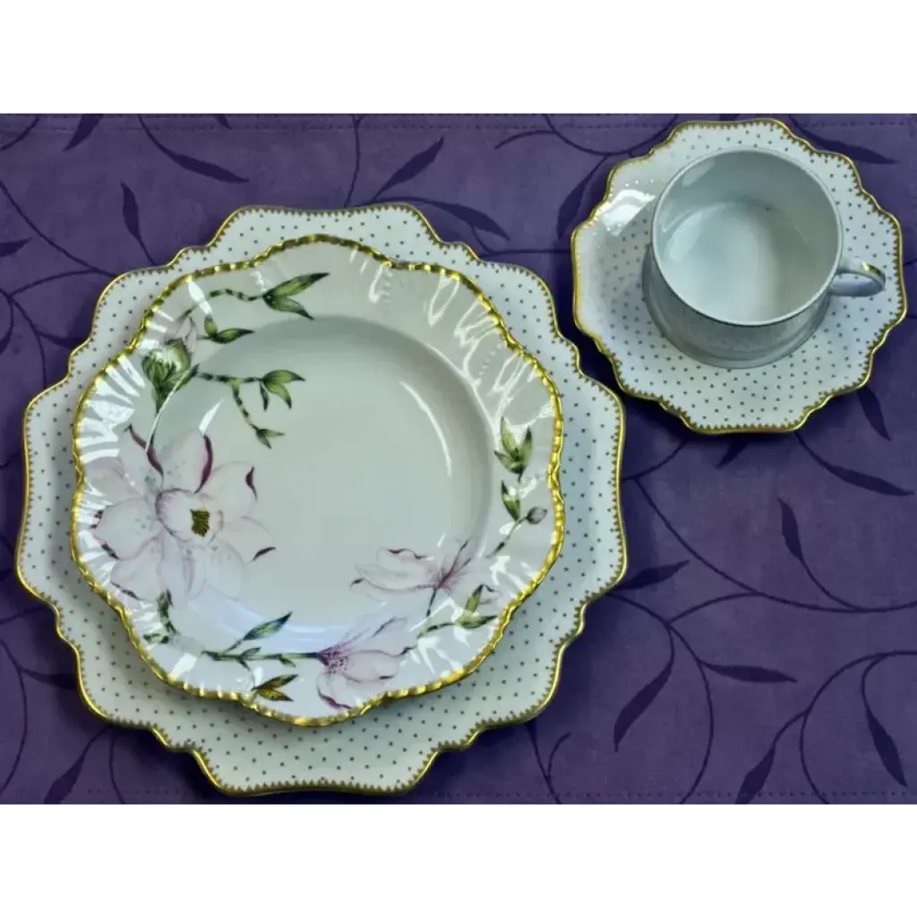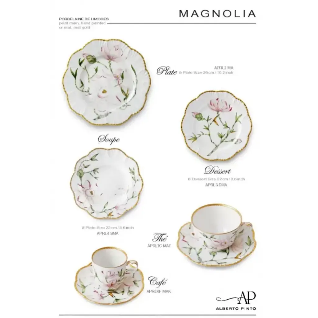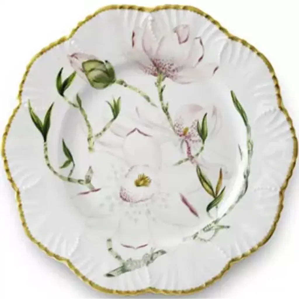 Magnolia dinnerware from Alberto Pinto brings the grace of southern hospitality to the table. Finished with matte gold, lovely magnolia flowers adorn each plate. One of France’s best-known interior designers, Alberto Pinto has designed not only homes but also yachts, private jets, luxury hotels, and restaurants. His work has been called the "haute couture of interior decorating." His prolific creations range in style from modern to classical to Asian-inspired and floral themes, and all of them are executed superbly on Limoges porcelain to create art for your table.