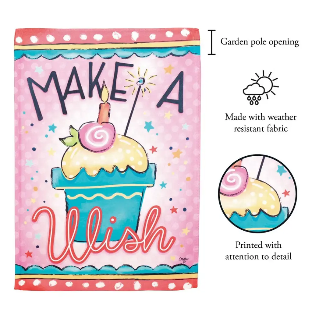 This garden flag by Magnolia Garden is designed with a combination of fabric appliques and exquisitely detailed embroidery on both the front and back; Flagpole sold separately. Features the phrase, "Make a Wish" in trendy font around a large cupcake with candle and sparkler on a festive background. Made of quality polyester double thickness material; These flags are heavier than most others on the market and will hold up for longer, They will retain its color and beauty for years if displayed in shade or semi-shade, and is rainproof; Measures approximately 13 inches wide and 18 inches tall. Perfect for displaying in a garden, on its own or as part of a garden display year-round; Fits most standard garden poles, sold separately; Care Instructions: Handwash in cold water, Air dry with no heat. Contained in protective packaging; Ready for easy gifting for a housewarming, birthday, or any special occasion