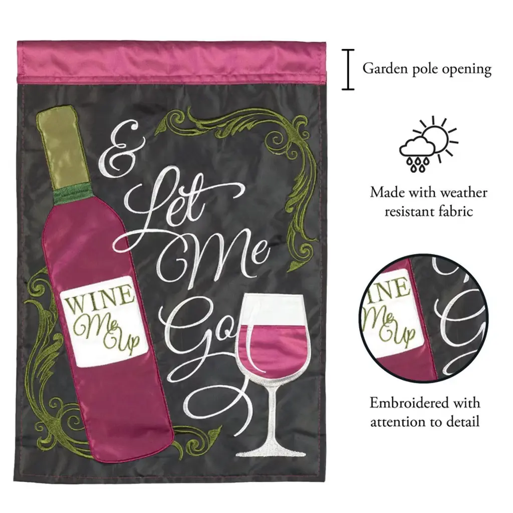 This garden flag by Magnolia Garden is designed with a combination of fabric appliques and exquisitely detailed embroidery on both the front and back; Flagpole sold separately. Features the phrase, "Wine Me Up, and Let Me Go" in trendy font on and beside a wine bottle and wine glass, surrounded by gold corner flourishes. Made of quality polyester double thickness material; These flags are heavier than most others on the market and will hold up for longer, They will retain its color and beauty for years if displayed in shade or semi-shade, and is rainproof; Measures approximately 29 inches wide and 42 inches tall. Perfect for displaying in a garden, on its own or as part of a garden display year-round; Fits most standard garden poles, sold separately; Care Instructions: Handwash in cold water, Air dry with no heat. Contained in protective packaging; Ready for easy gifting for a housewarming, birthday, or any special occasion