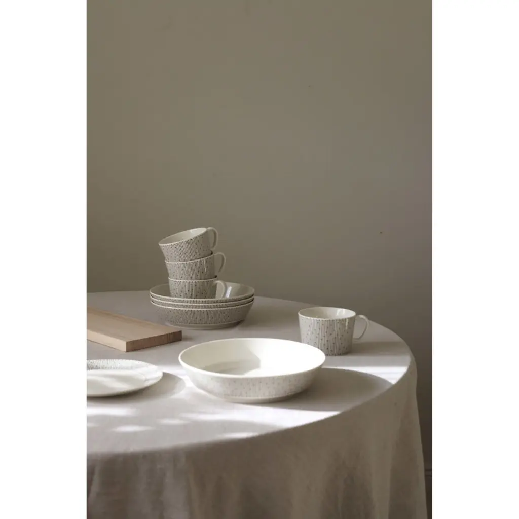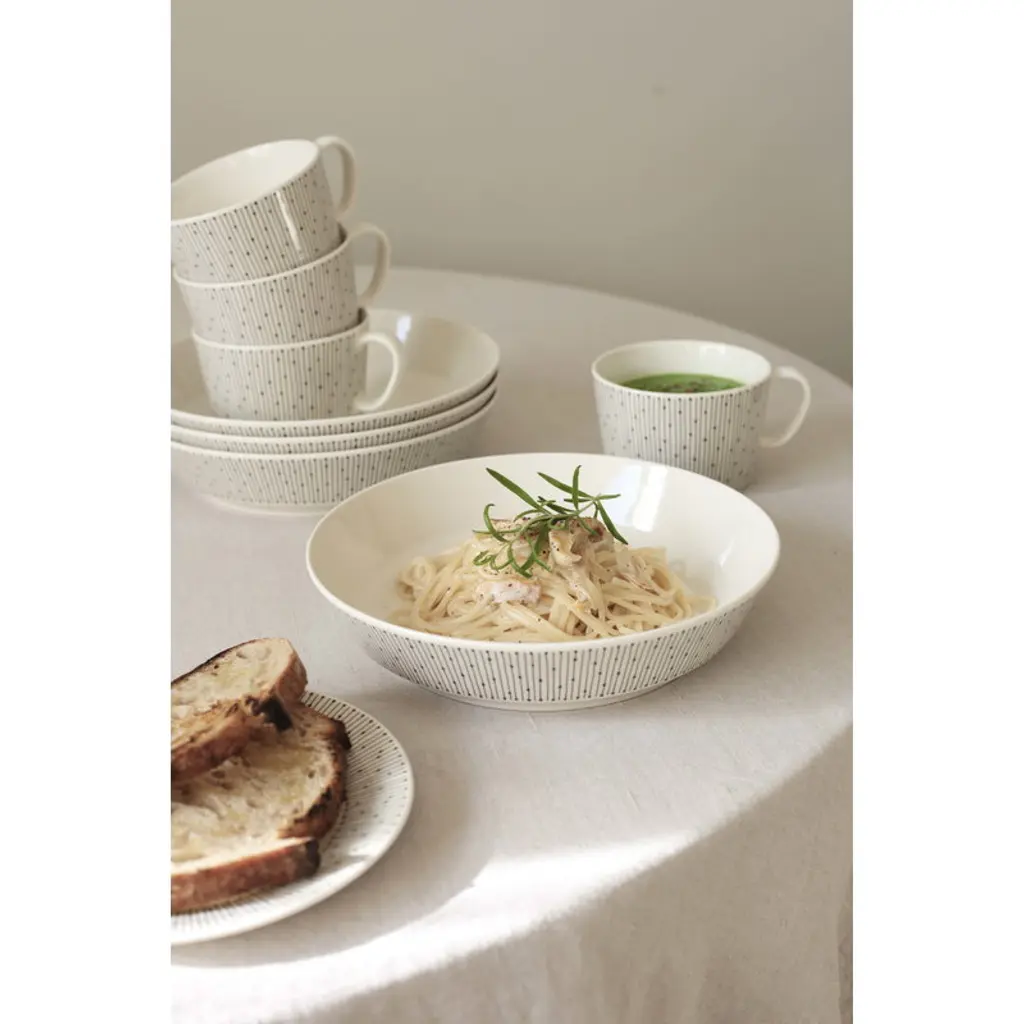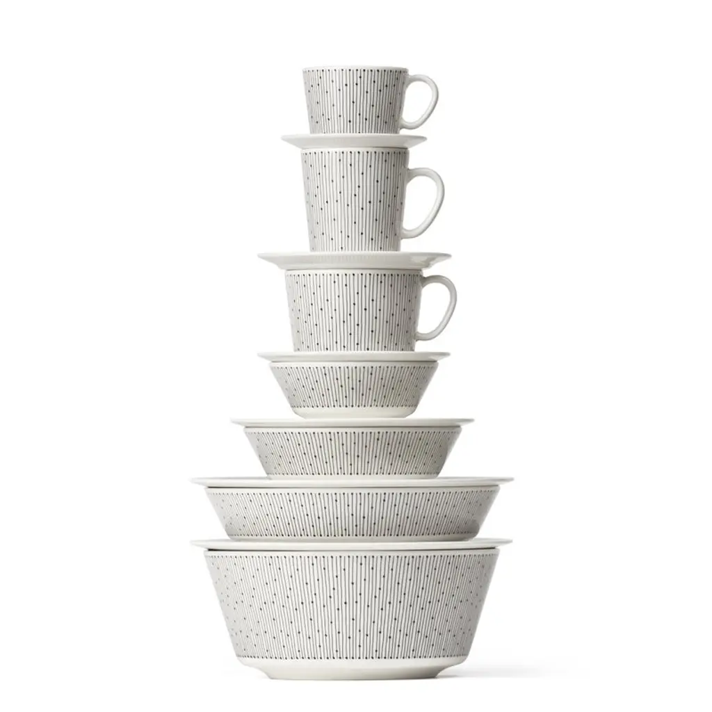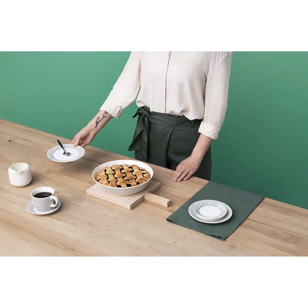 Arabia’s Mainio Sarastus plate gives kitchens and table settings a touch of timeless Finnish design with a contemporary spirit. Mainio Sarastus is a tableware collection launched by Arabia in 2018, designed to bring beauty and practicality especially to small kitchens and urban homes. The most essential elements in its product design were versatility, durability and stackability: besides dining, the ceramic tableware is designed for preparing and storing food, and the plates can be used as lids for the bowls. Symbolizing the power of light, the Sarastus (”dawn”) pattern was inspired by Raija Uosikkinen’s Ivalo decoration from 1965, with its rhythmic lines arranging into a new, fresh shape. The lightweight and stackable Mainio Sarastus cups, bowls and plates are dishwasher-proof and suitable for the oven as well as the freezer.