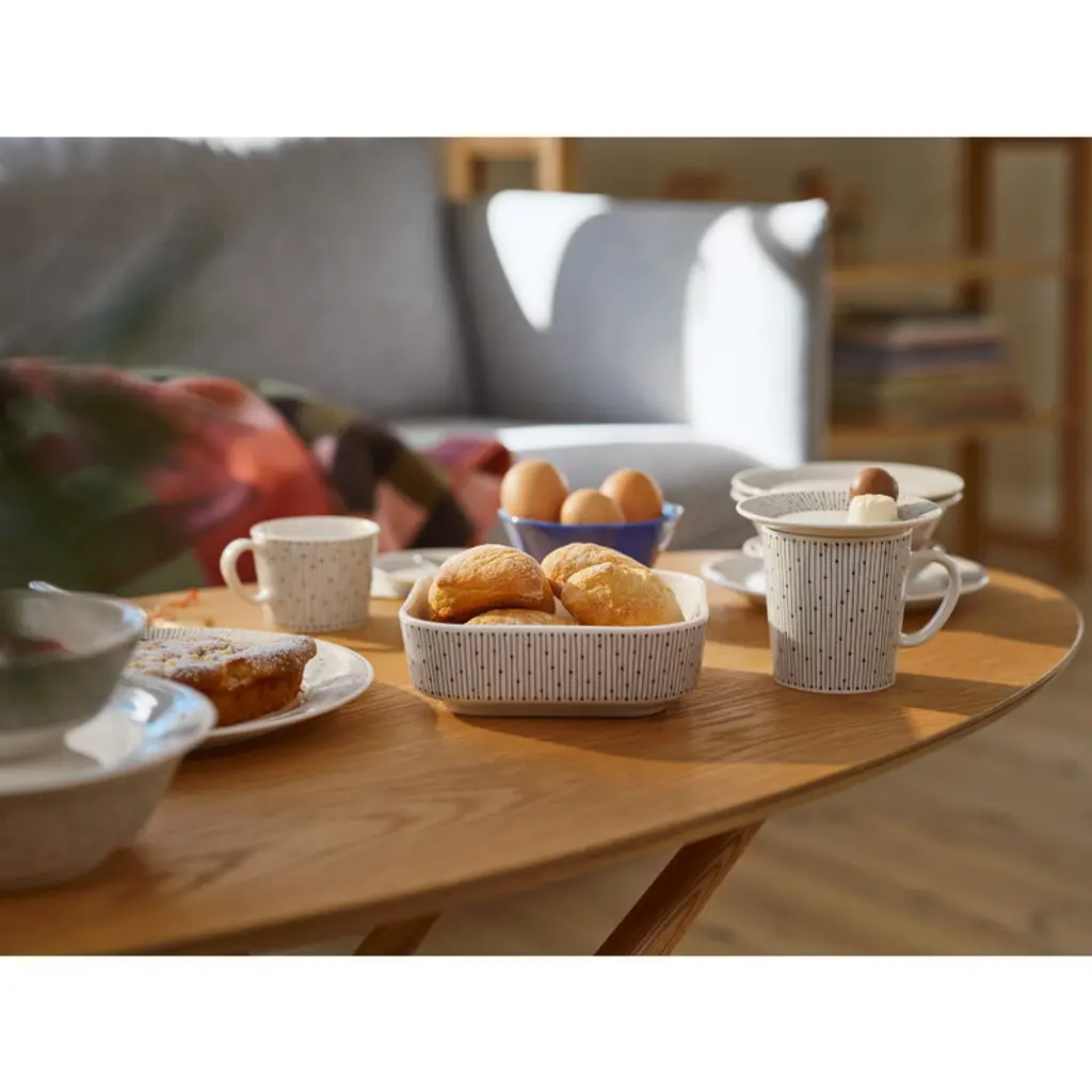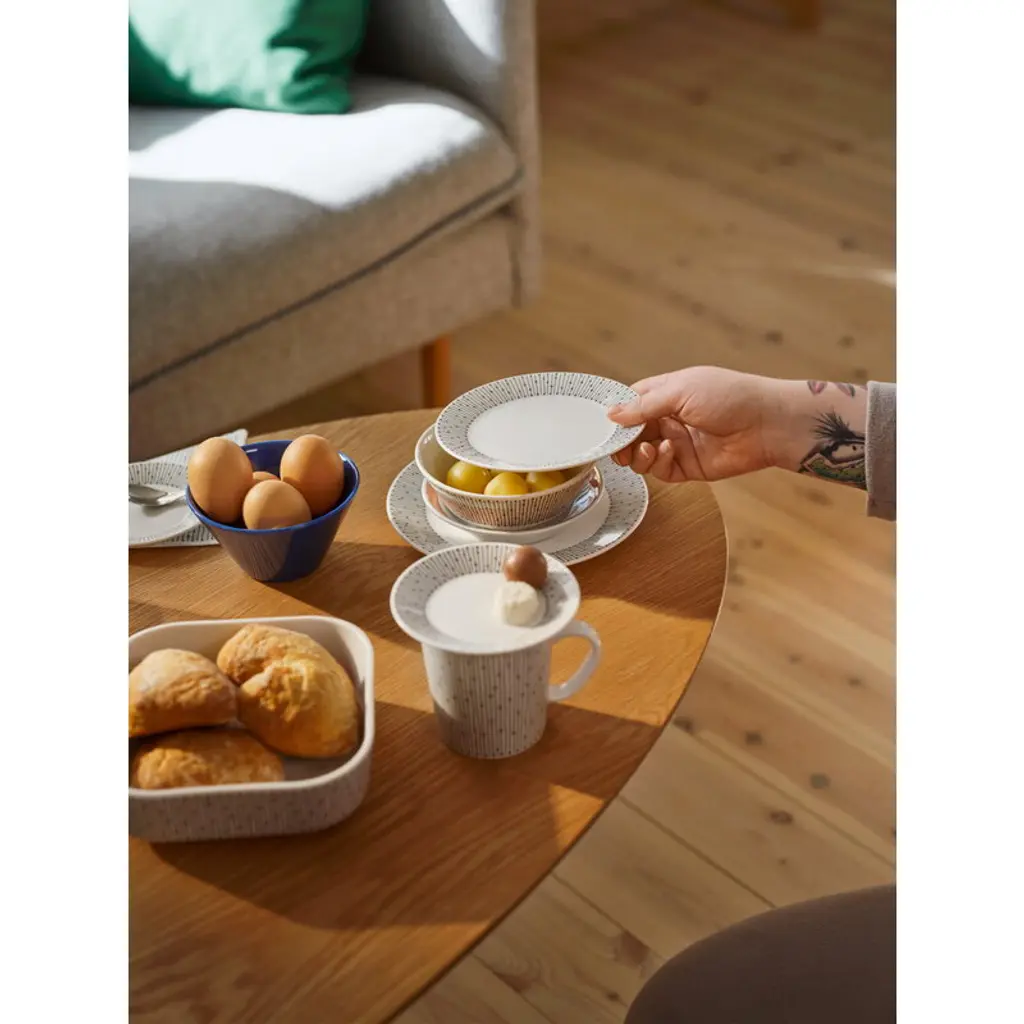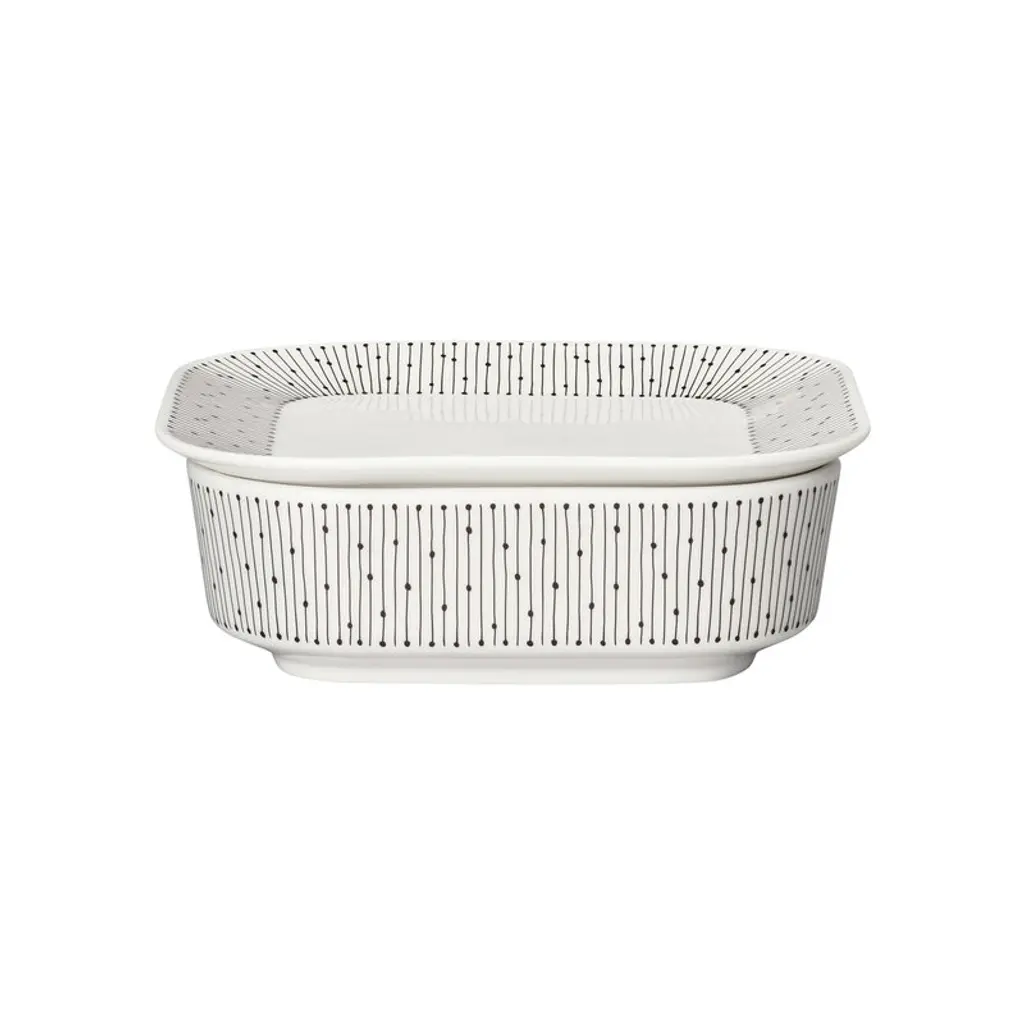 Arabia’s Mainio Sarastus oven dish gives kitchens and table settings a touch of timeless Finnish design with a contemporary spirit. The patterned oven dish is ideal for cooking, baking and serving. The Mainio Sarastus tableware collection is designed to bring beauty and practicality especially to small kitchens and urban homes. The most essential elements in its product design were versatility, durability and stackability: besides dining, the ceramic tableware is designed for preparing and storing food, and the plates can be used as lids for the bowls or oven dishes. Symbolizing the power of light, the Sarastus (”dawn”) pattern was inspired by Raija Uosikkinen’s Ivalo decoration from 1965, with its rhythmic lines arranging into a new, fresh shape. The lightweight and stackable Mainio Sarastus pieces are dishwasher-proof and suitable for the oven as well as the freezer.