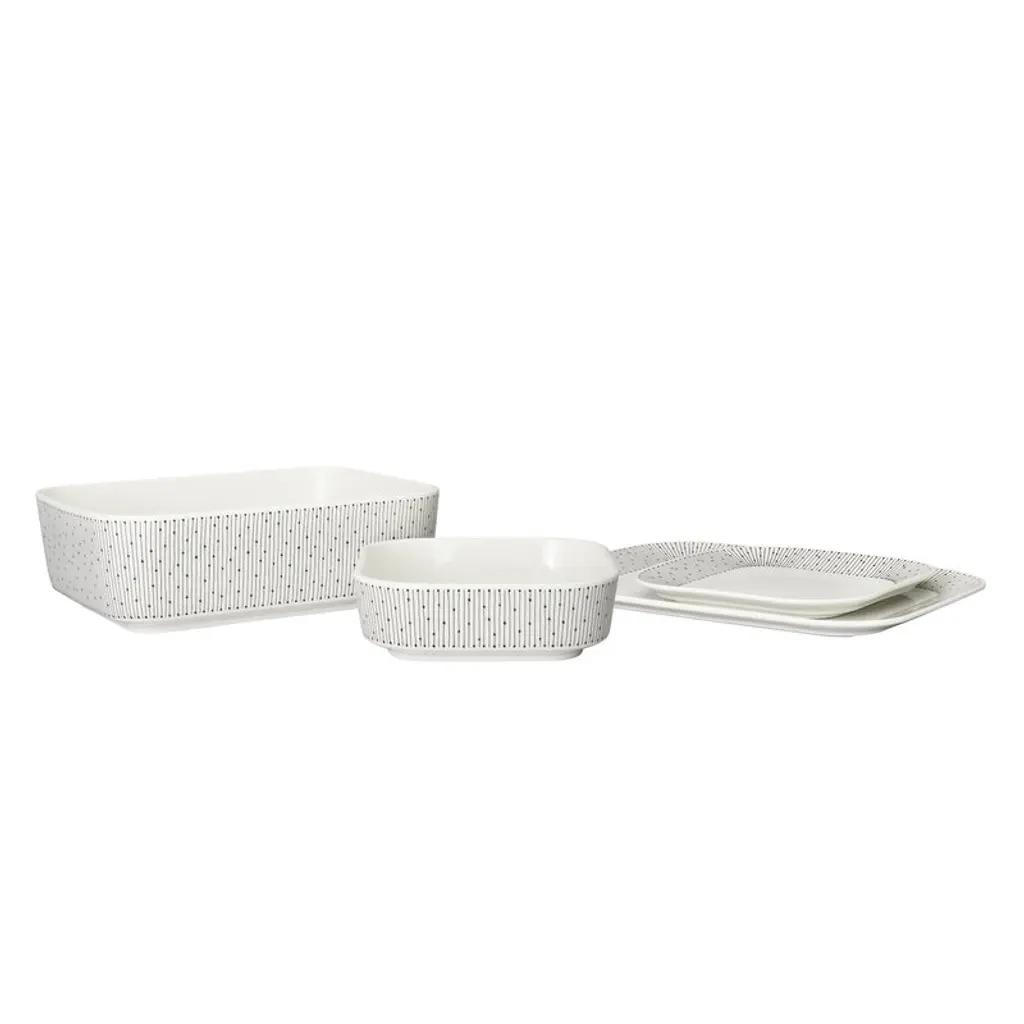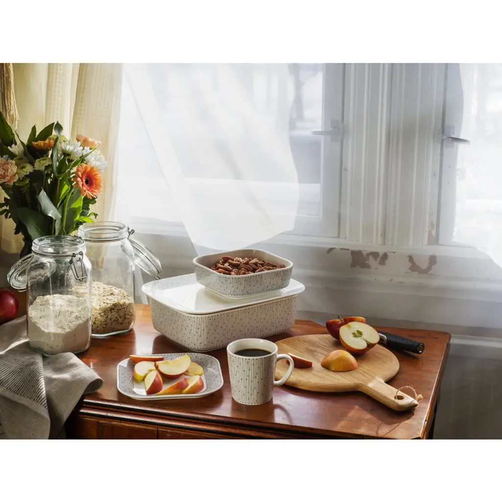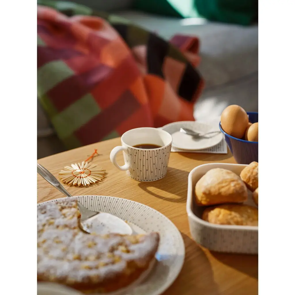 Arabia’s Mainio Sarastus oven dish gives kitchens and table settings a touch of timeless Finnish design with a contemporary spirit. The patterned oven dish is ideal for cooking, baking and serving. The Mainio Sarastus tableware collection is designed to bring beauty and practicality especially to small kitchens and urban homes. The most essential elements in its product design were versatility, durability and stackability: besides dining, the ceramic tableware is designed for preparing and storing food, and the plates can be used as lids for the bowls or oven dishes. Symbolizing the power of light, the Sarastus (”dawn”) pattern was inspired by Raija Uosikkinen’s Ivalo decoration from 1965, with its rhythmic lines arranging into a new, fresh shape. The lightweight and stackable Mainio Sarastus pieces are dishwasher-proof and suitable for the oven as well as the freezer.