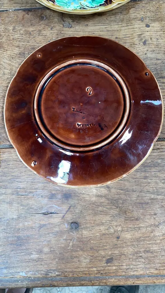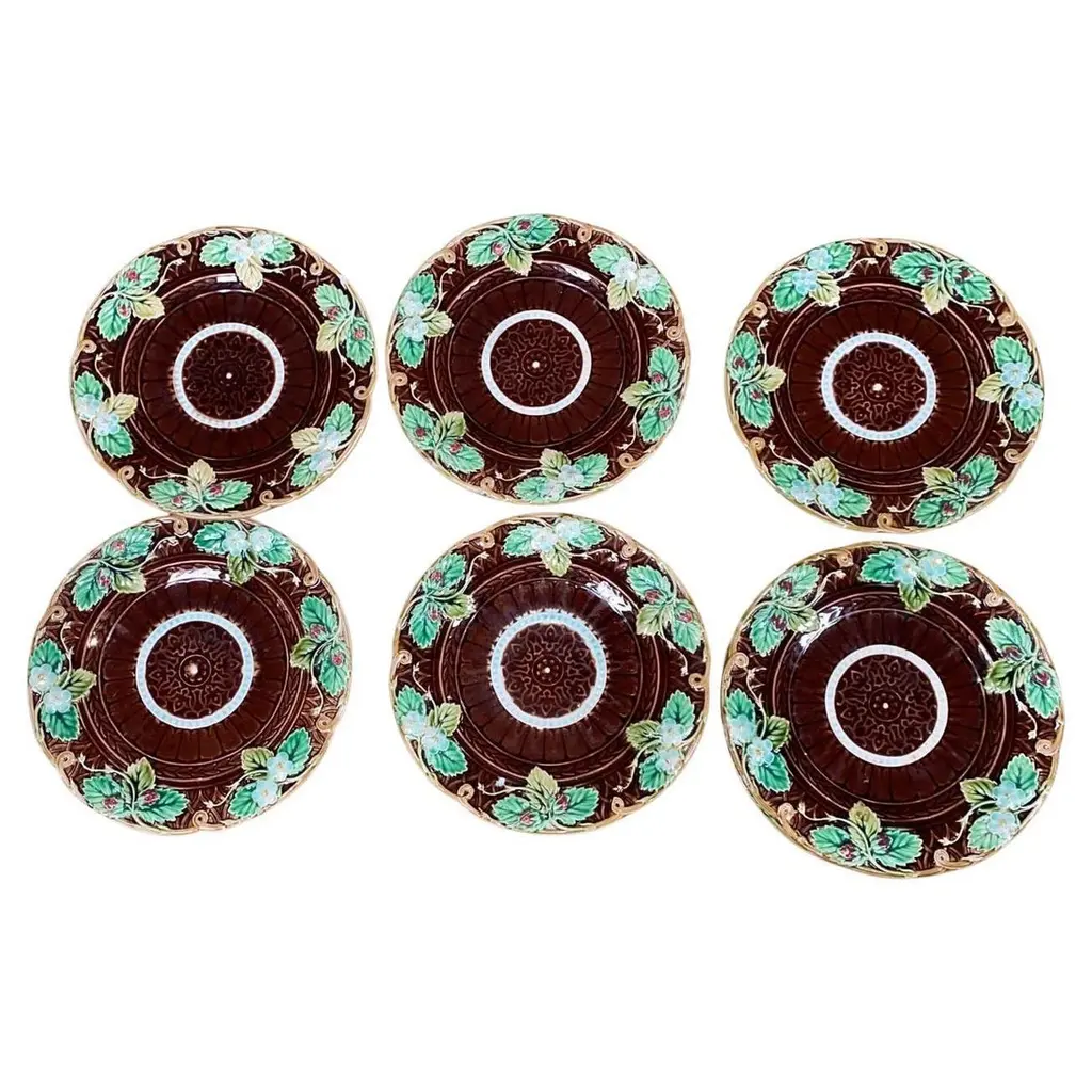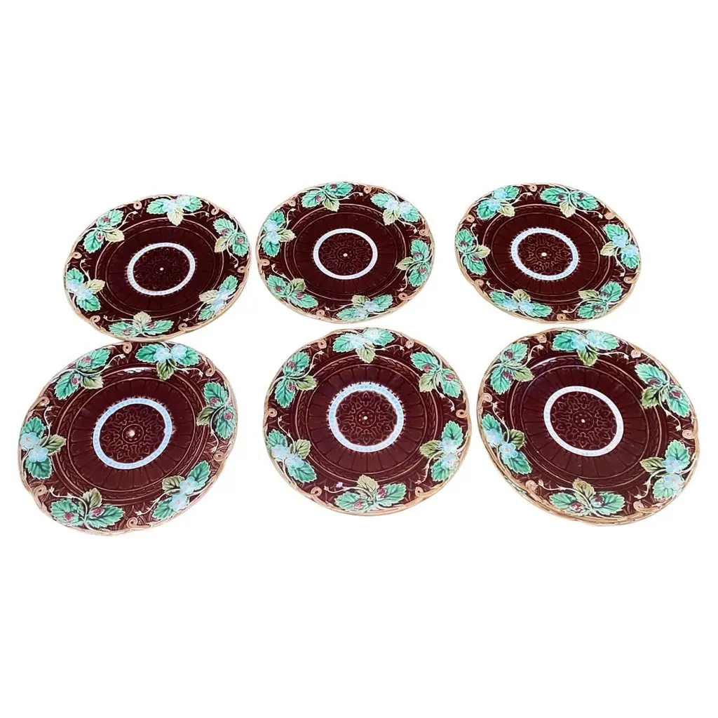 Rare Majolica strawberries plate signed Sarreguemines, circa 1870.Rare chocolate color.7 plates available individually.
